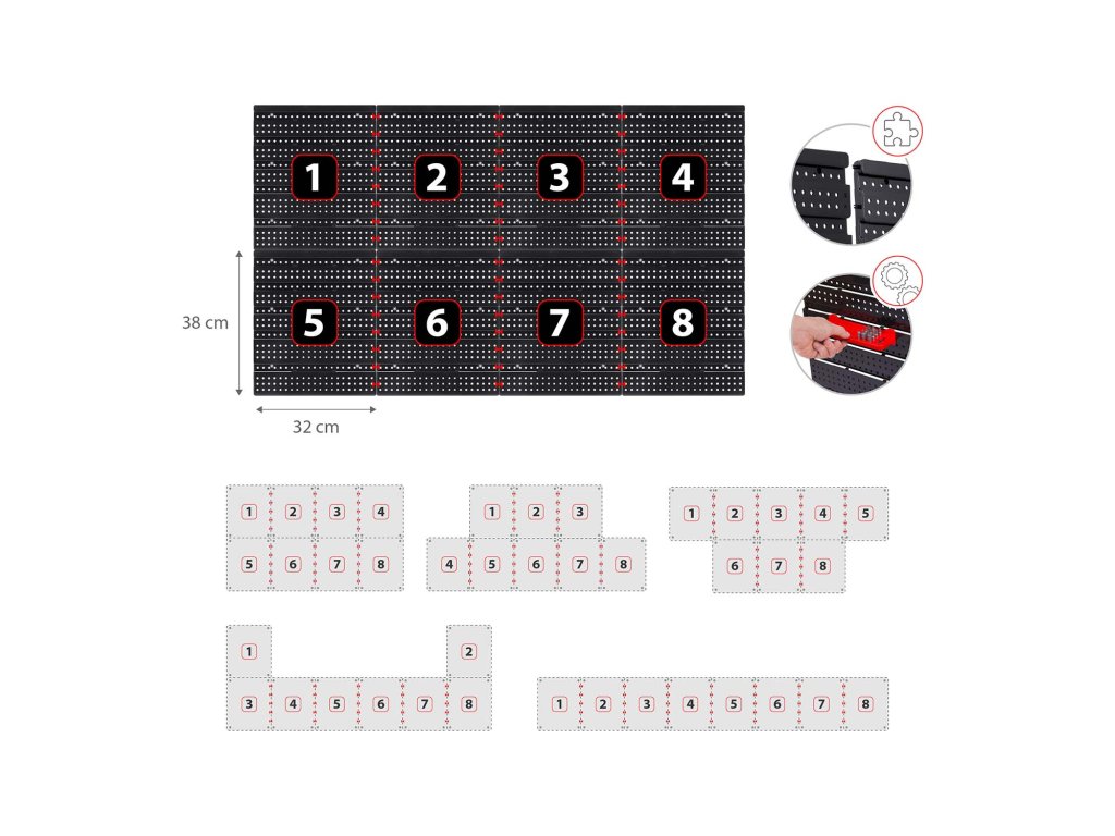 A szerszámtábla moduláris szerkezettel rendelkezik, így szabadon kombinálhatja a paneleket, és az elrendezést igényeihez igazíthatja. Az egyszerű összeszerelés gyors és kényelmes csatlakozást tesz lehetővé az egyes elemek között, a különböző kombinációk pedig rugalmasságot biztosítanak a munkatér szervezésében.