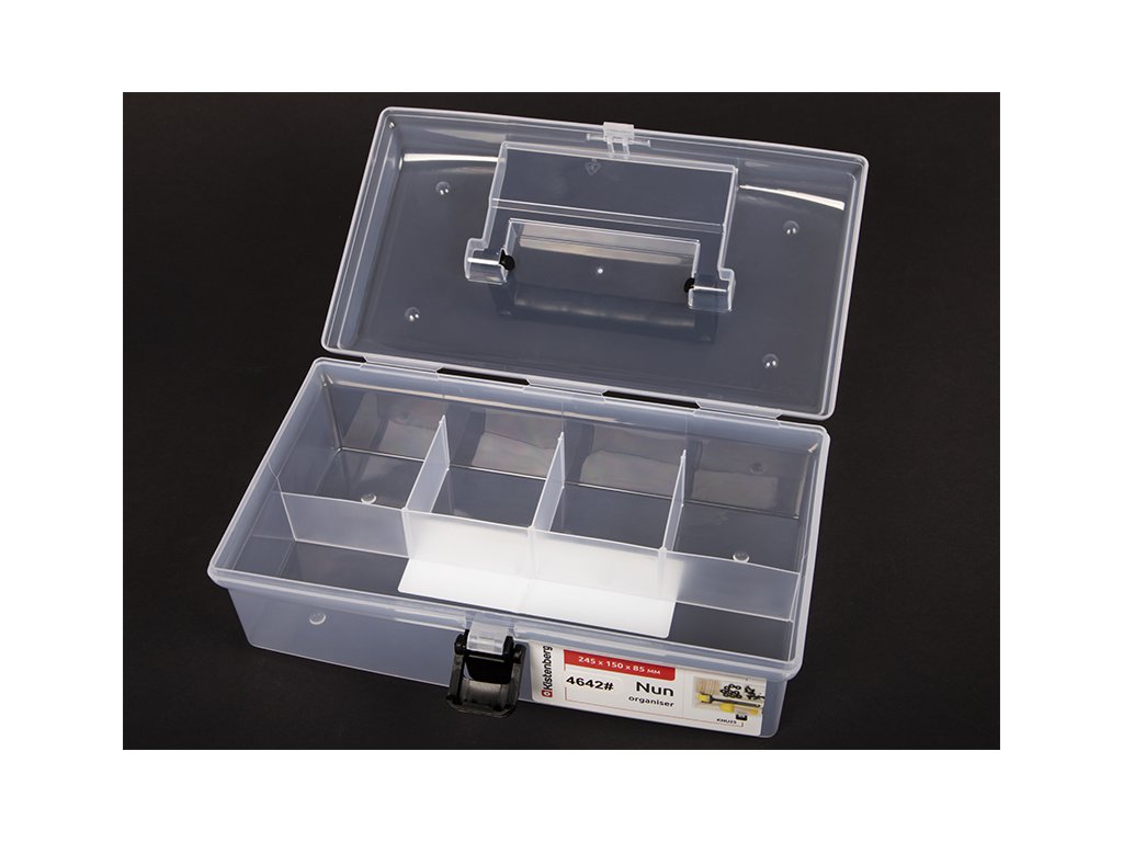 Szervező a jól bevált Nun termékcsaládból, ideális barkácsoláshoz és horgászoknak, de otthonra is. Átlátszó, így tartalma mindig jól látható és könnyen hozzáférhető. A kapocsnak és a kényelmes fogantyúnak köszönhetően a tároló könnyen hordozható.