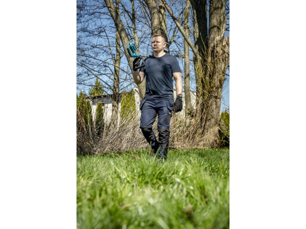 A nadrág magasabb hátsó része további védelmet nyújt a hátnak, különösen gyakori hajolgatás vagy ülő munkavégzés esetén. A nadrág rendelkezik továbbá térdvédők elhelyezésére alkalmas hellyel, ami növeli a kényelmet és biztonságot, valamint csökkenti a térdsérülés kockázatát hosszan tartó térdelő munkavégzés során.