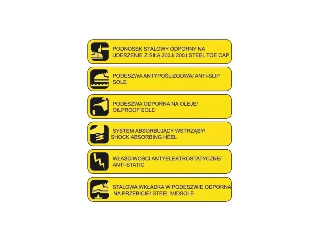 - CE tanúsítvánnyal és EN IS O 20345:2011 szabványnak megfelelő biztonsági cipő