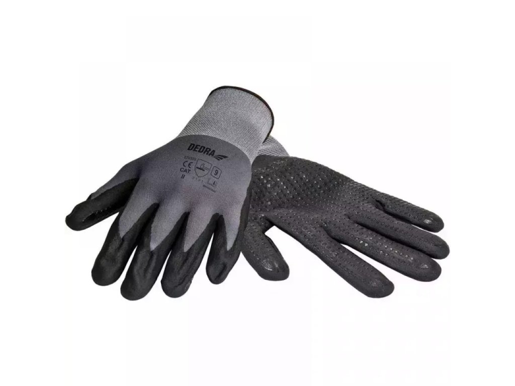 BH1006R09 A védőkesztyűk lycrából készültek, amit nylonnal erősítettek meg. Ennek a keveréknek köszönhetően a kesztyűk ellenállnak a kopásnak és a mechanikai sérüléseknek. A kesztyűk belső részét mikronitril réteggel is bevonták a jobb tapadás érdekében. A kesztyűk alkalmasak műhely-, kert- és barkácsmunkákhoz.
