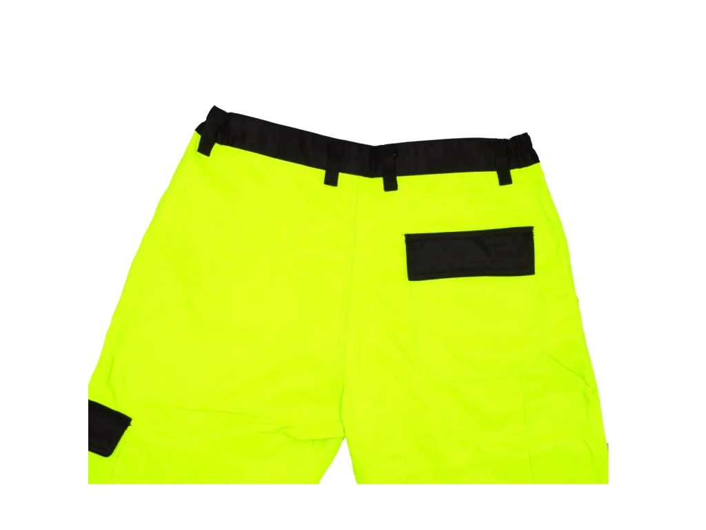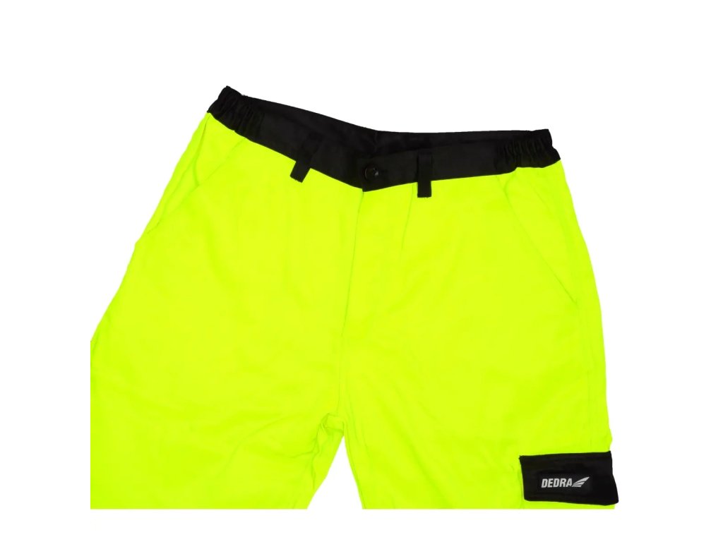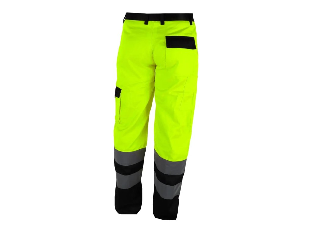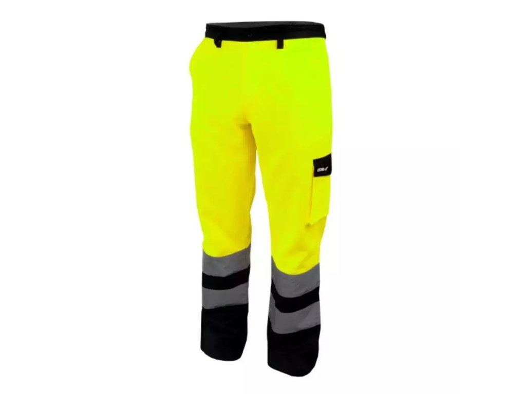A visszaverő biztonsági nadrágok poliészter és pamut keverékéből készülnek, 250 g/m? súllyal. A nadrágok elasztikus derékkal rendelkeznek. Az nadrágok 5 praktikus és funkcionális zsebbel, valamint egy kalapács számára kialakított övtartóval rendelkeznek. Fényvisszaverő szalagok a nadrágokon és a derékon a jobb láthatóság érdekében nehéz körülmények között vagy sötétedés után. Elérhető méretek S-től 2XL-ig. Sárga szín.