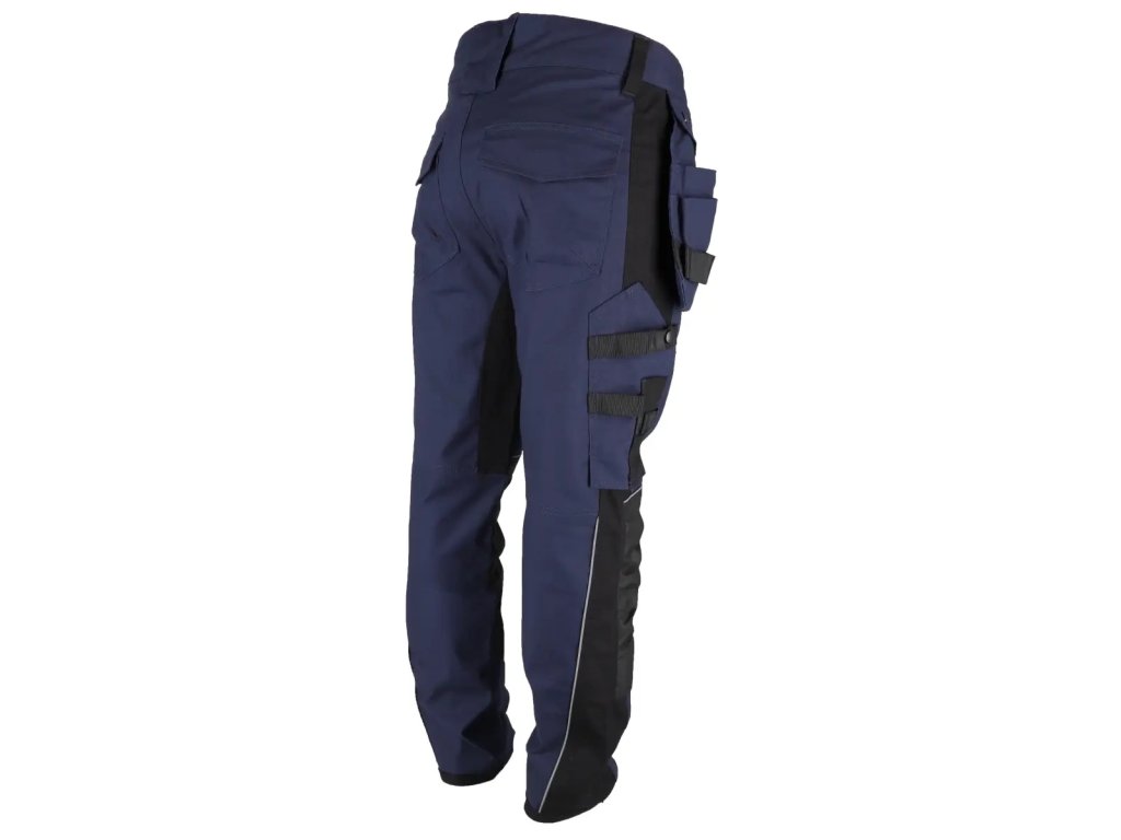 A nadrág magasabb hátsó része a hát további védelmét szolgálja, különösen gyakori hajolgatás vagy ülő munkavégzés során. A nadrág helyet biztosít a térdvédőknek is, ami növeli a kényelmet és védelmet nyújt a térdeknek hosszan tartó térdelés közben.