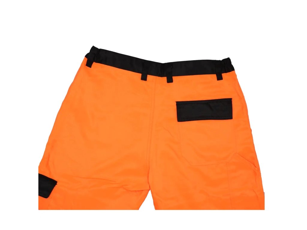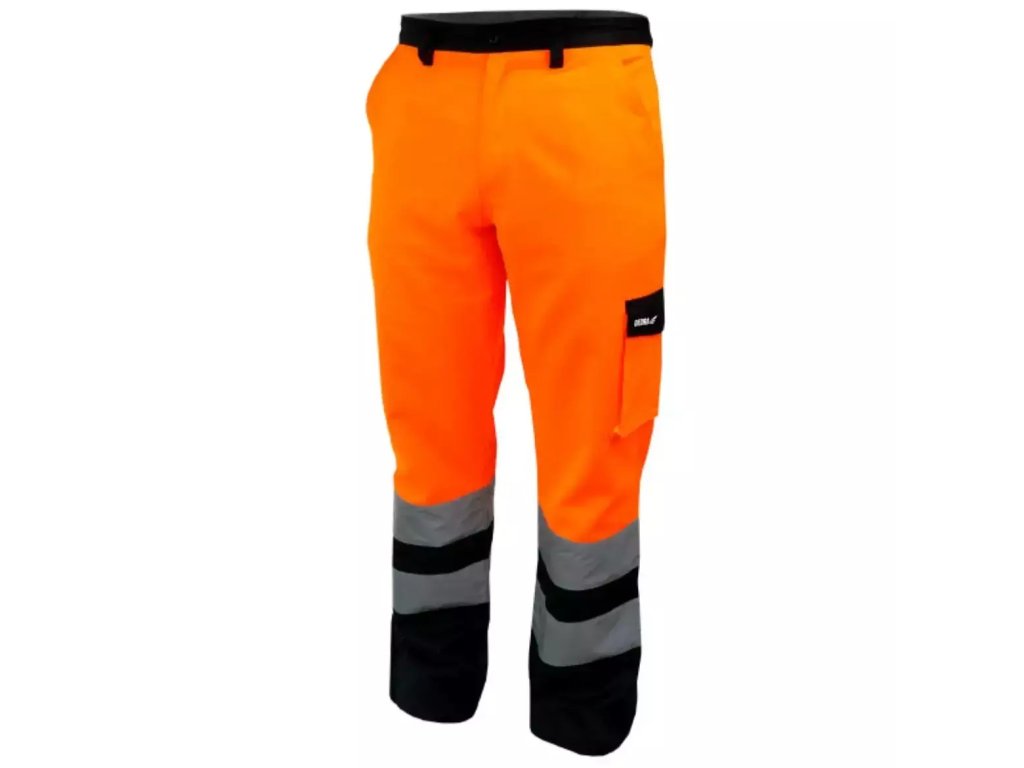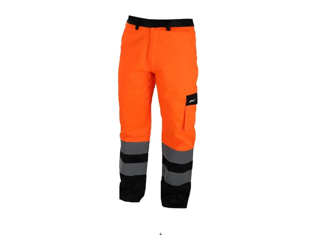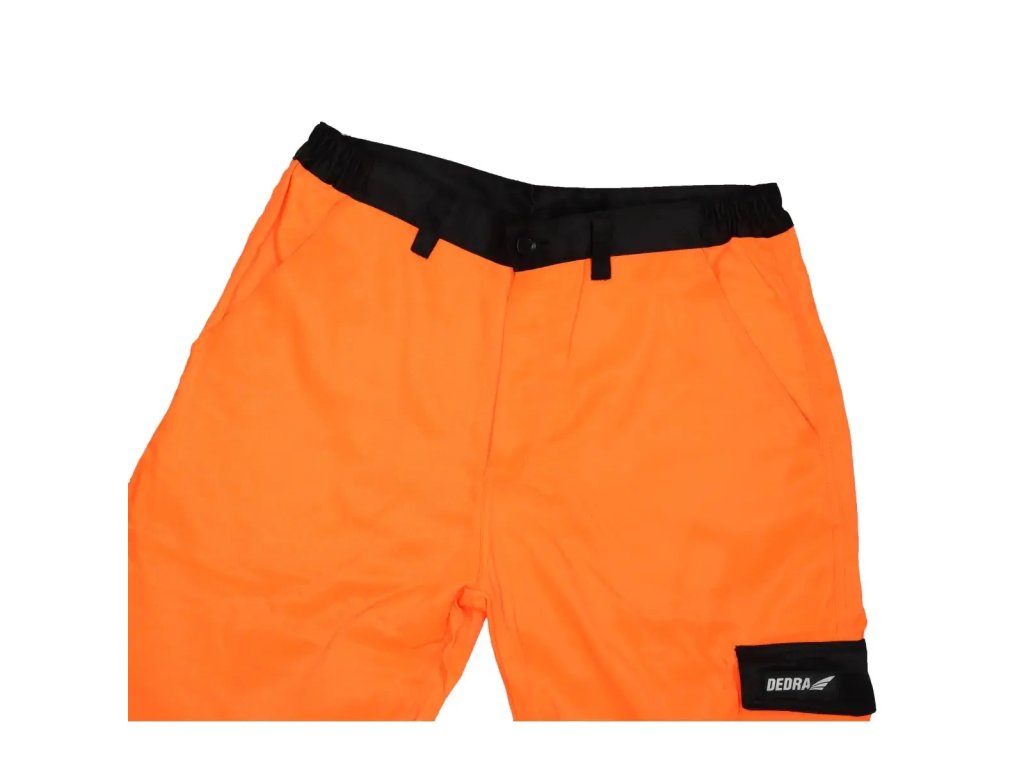 A védőövvel ellátott nadrág poliészter és pamut keverékéből készült, 250 g/m2 súlyú. A nadrág rugalmas derékrésszel rendelkezik. A nadrágon 5 praktikus és funkcionális zseb található, valamint egy kalapácstartó öv hurok. Fényvisszaverő szalagok a nadrágszárakon és a derékrészen a jobb láthatóság érdekében nehéz körülmények között vagy sötétedés után. Elérhető méretek S-től 2XL-ig. Narancssárga szín.
