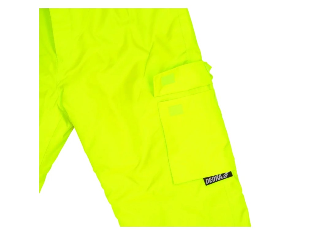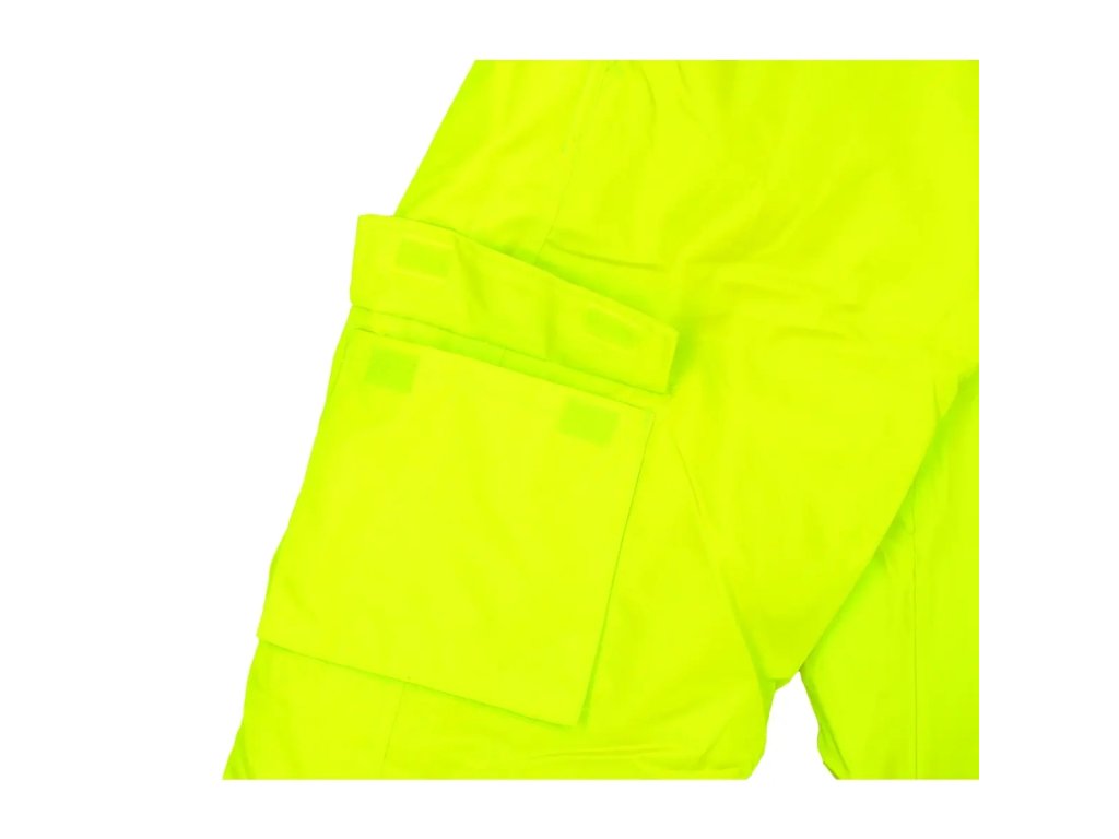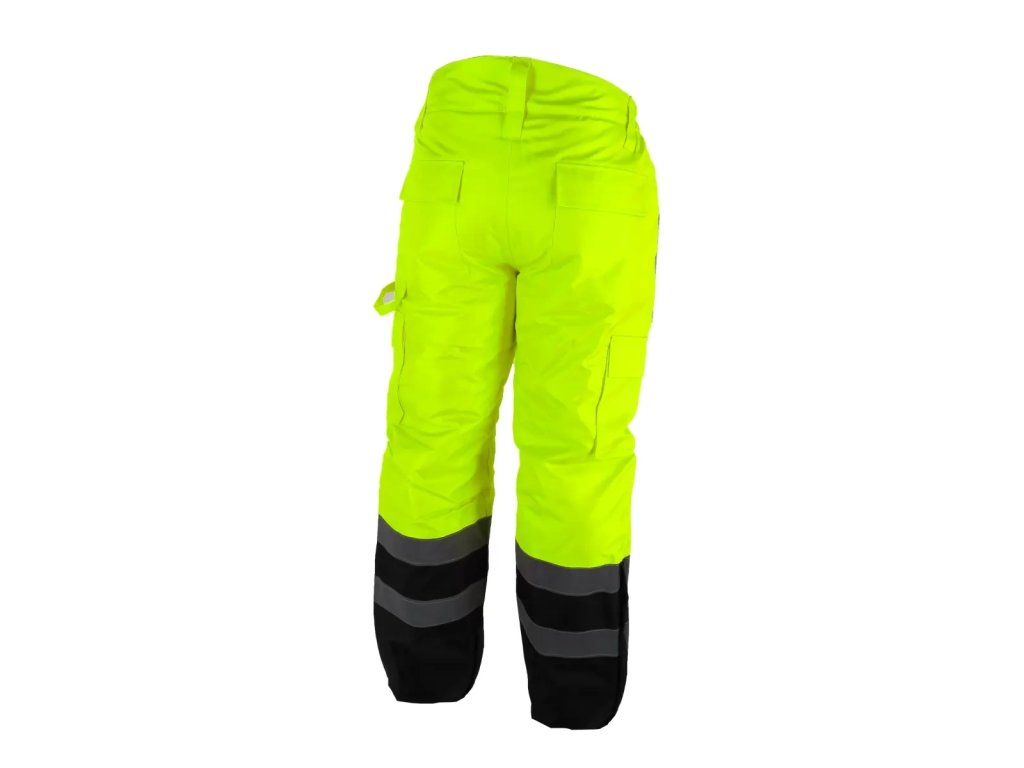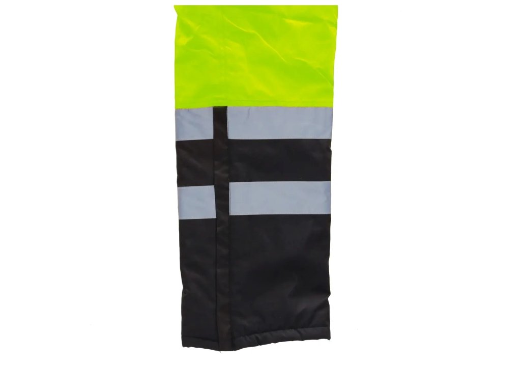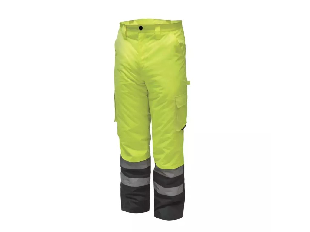 A reflexiós melegítő nadrág Oxford 300D szövetből készült, 180 g/m? grammsúllyal. A szövet szélálló és vízlepergető 2000 mm-ig. Emellett vízálló varratokat használnak. A nadrágnak steppelt poliészter bélése van 180 g/m? és taft bélése a belső oldalon. A nadrágoknak rugalmas dereka és hátul magas illeszkedése van. Praktikus és funkcionális zsebek és kalapács hurok. A nadrágokon fényvisszaverő csíkok találhatók a lábszárakon, valamint a derékon, ami biztosítja a láthatóságot nehéz körülmények között vagy szürkület után. A szalagok lezártak, 5 cm szélesek és az EN20471 szabványnak megfelelnek. Elérhető méretek S-től 3XL-ig.