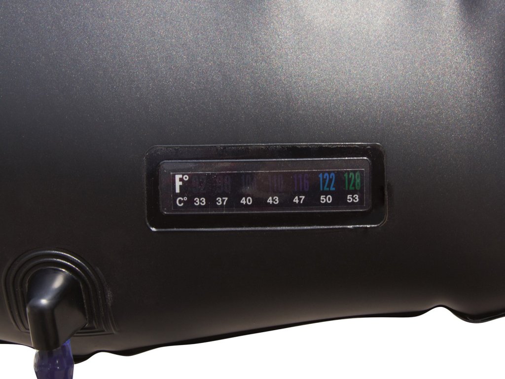 Ez a zuhany 20 liter vizet képes tárolni, amely a nap sugarainak és az anyag fekete színének köszönhetően gyorsan felmelegszik, akár 40 °C-ra.