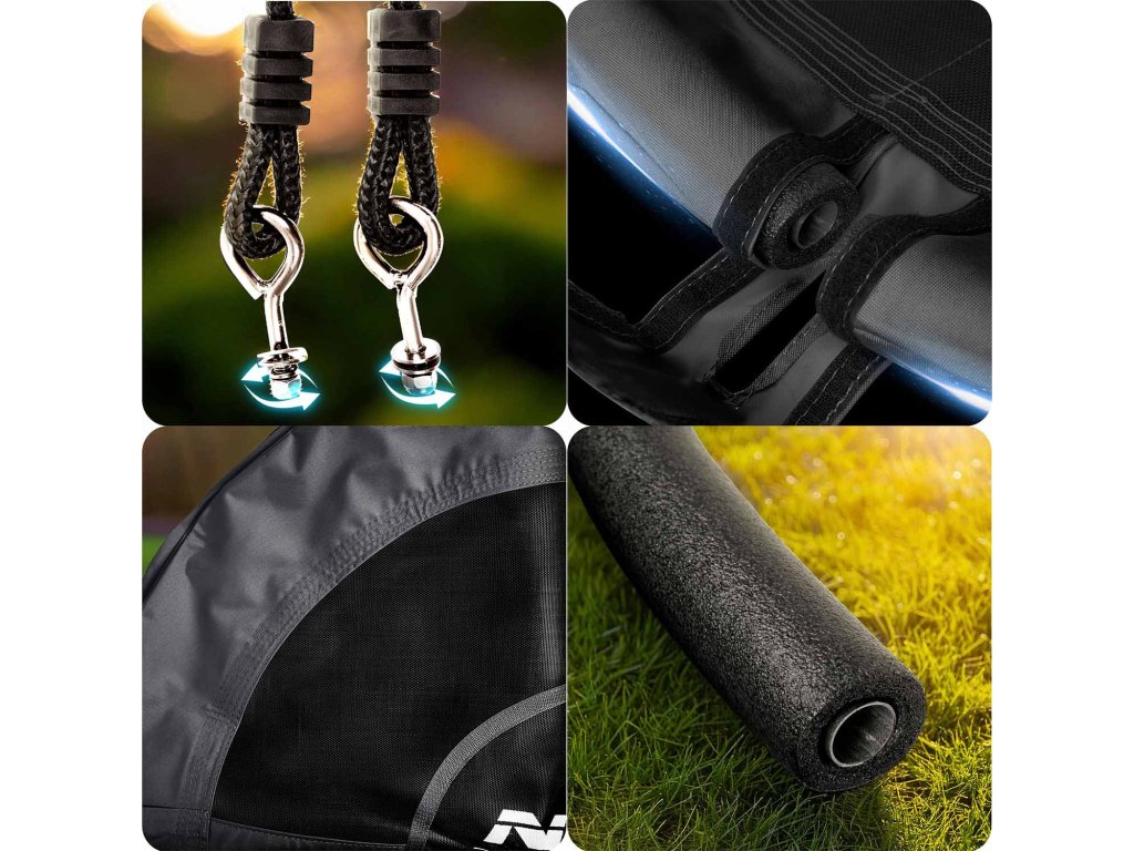 Acélvázas hinta puha PE védőhabbal borítva, több varrással és vastag függesztő kötelekkel. Garantálja a biztonságot, stabilitást és tartósságot.
