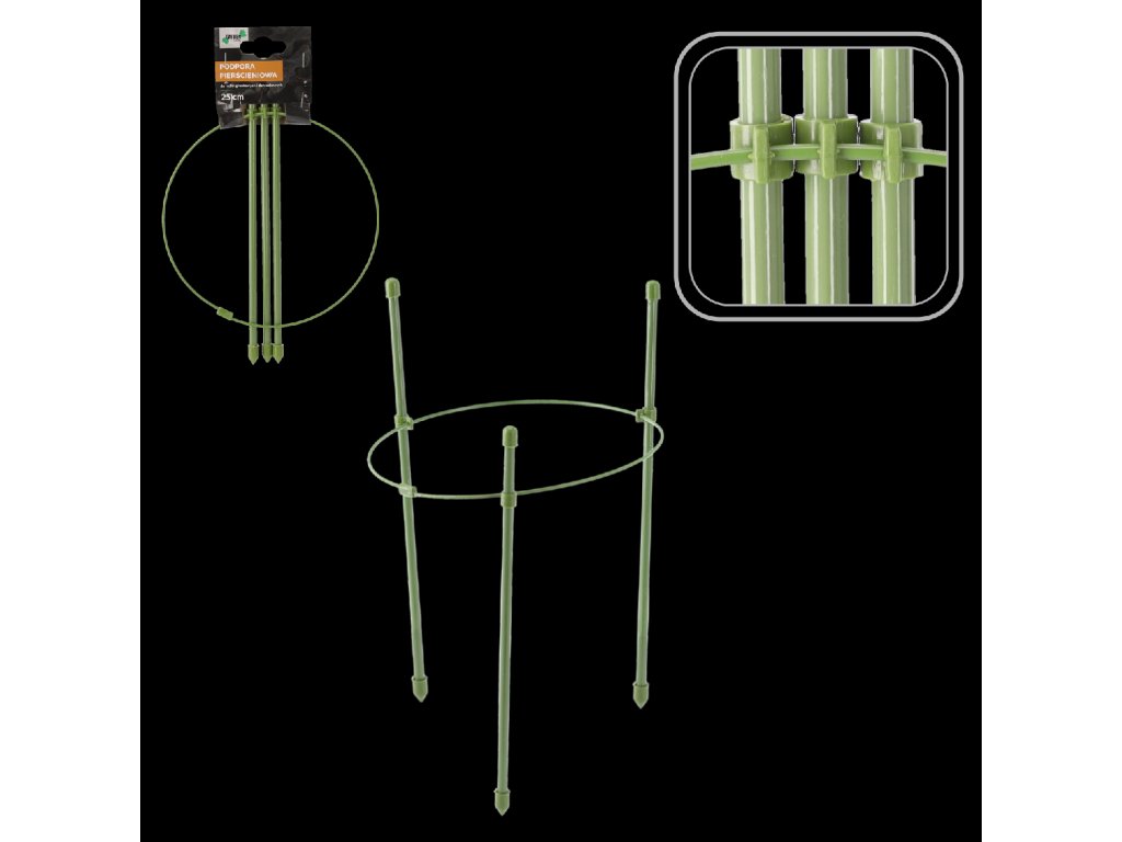 A kör alakú alátét, oszlopokkal, remek kiegészítője a cserepes növényeknek és a virágágyásoknak. A fém szilárd kivitelezése és műanyag felületi kezelése miatt nagyon ellenálló a sérülésekkel és kedvezőtlen időjárási viszonyokkal szemben. A zöld szín miatt a támogatás szinte láthatatlanná válik a növény háttérben. Különösen hasznos olyan növények termesztésénél, mint a áfonya vagy a hortenzia. A támasz megakadályozza a növény "megcsonkítását", és lehetővé teszi a harmonikus növekedést. Érdekes alternatívát jelenthet az egyedi botok számára. A zöld szín tökéletesen illik a növényekhez, és dekoratív szerepet is betölt a kertben. A támaszt a földbe kell helyezni a növény mellé, és a szárat hozzá kell kötni, ami stabilizálást és védelmet biztosít a töréstől, még szeles időben is.