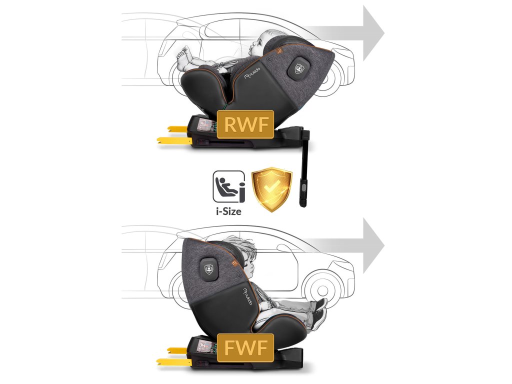 - az üléssel szembeni pozícióban szerelve (RWF) 40-105 cm magas gyermekek számára,