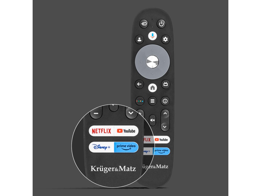 A Kruger&Matz TV-hez mellékelt távirányítót a kényelmes és intuitív használat érdekében tervezték. A távirányító hivatkozásokat tartalmaz a legnépszerűbb alkalmazásokhoz, mint például a Netflix, YouTube és Amazon Prime Video. Ezekkel gyorsan elindíthatja kedvenc tartalmait anélkül, hogy menükben keresne vagy alkalmazásokat keresne.