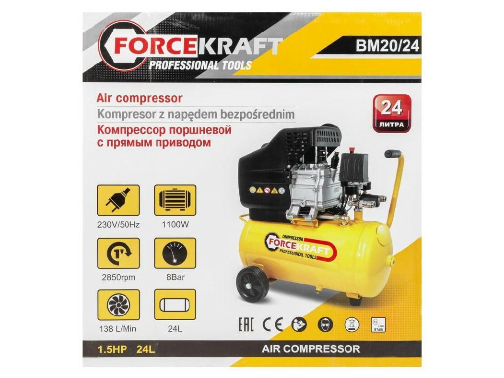 - #Maximális nyomás: 9 bar Munkanyomás: 8 barMotorteljesítmény: 2,8 KW/ 3,8LEFrekvencia: 50HzTartály kapacitás: 24LFeszültség: 230VMéretek (h x sz x m): 58x31x57 cmÖntöttvas hengerek: Igen