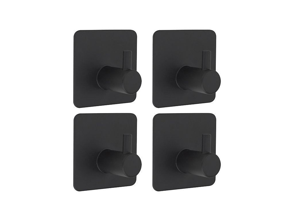 Akészlet 4 db fogast tartalmaz, amelyek tartós fekete alumíniumból készültek. Minden fogas mérete 4,5 x 4,5 cm. Ez lehetővé teszi, hogy ne csak mindennapi tárgyakat - kulcsokat, ruhákat -, hanem kissé nagyobb tárgyakat, például törölközőket - akár 1 kg súlyig - is elhelyezzen. Erős 3M ragasztóval ellátott fogasok