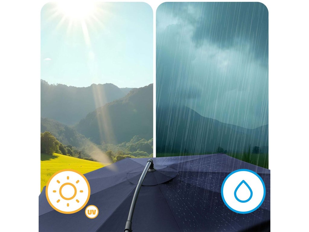 - Eső Nincs esély! A vízálló PE anyagnak köszönhetően napernyőnk hatékonyan véd minden csepp ellen.