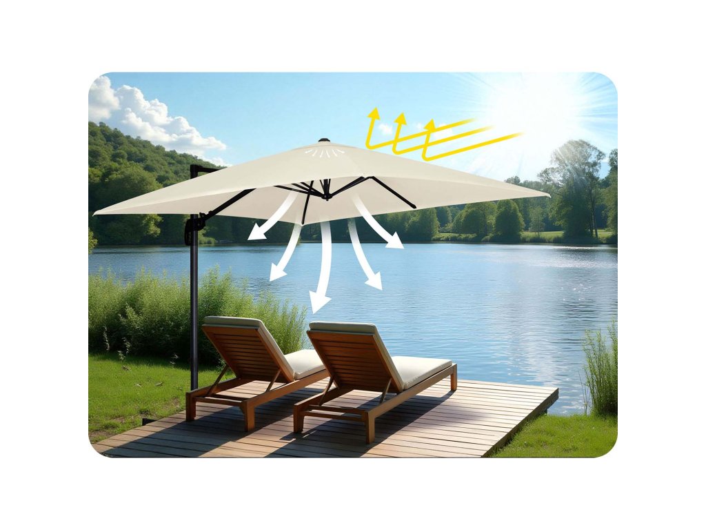 - A kertészeti napernyő tetején található szellőzőnyílás lehetővé teszi a levegő szabad áramlását, megakadályozva a hő felhalmozódását és az anyag túlzott feszülését.