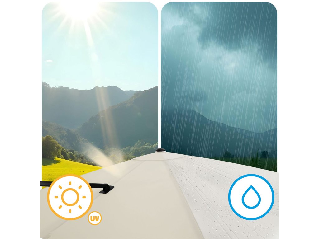 - Eső Nincs esélye! A vízálló PE anyagnak köszönhetően napernyőnk hatékonyan véd minden cseppel szemben.