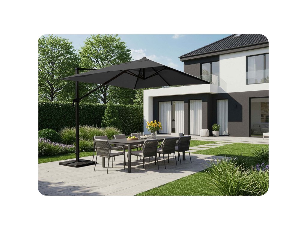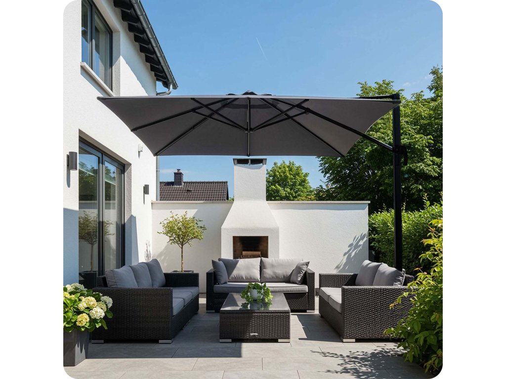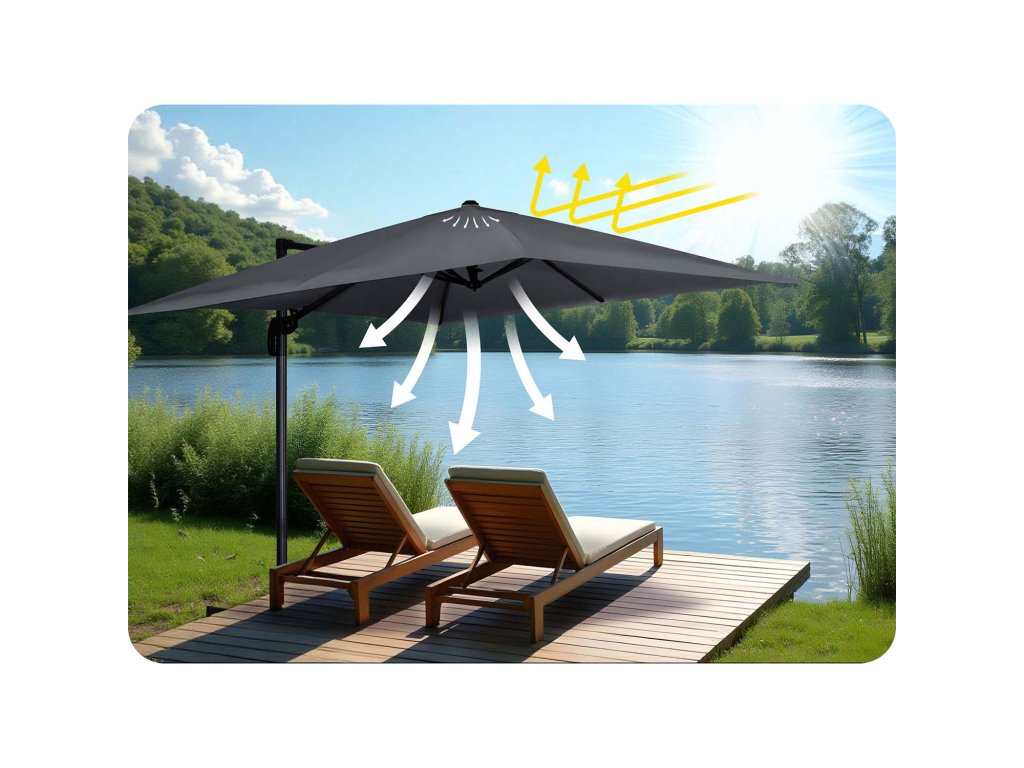 - A kertészeti napernyő tetején lévő szellőzőnyílás lehetővé teszi a szabad levegőáramlást, megakadályozva a hő felhalmozódását és az anyag túlfeszülését.
