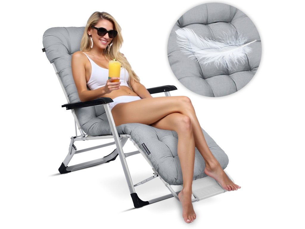 A ChillWell Luxury nyugágy befektetés a mindennapi, friss levegőn történő pihenés kényelmébe és komfortjába.Puha és rugalmas párna kiváló minőségű anyagból készült huzattal van borítva. Ennek köszönhetően ellenálló és gyengéd a bőrhöz. A nyugágy tartós, időjárásálló anyagokból készült, amelyek könnyen tisztíthatóak és ellenállnak a deformációnak és az UV sugárzásnak.