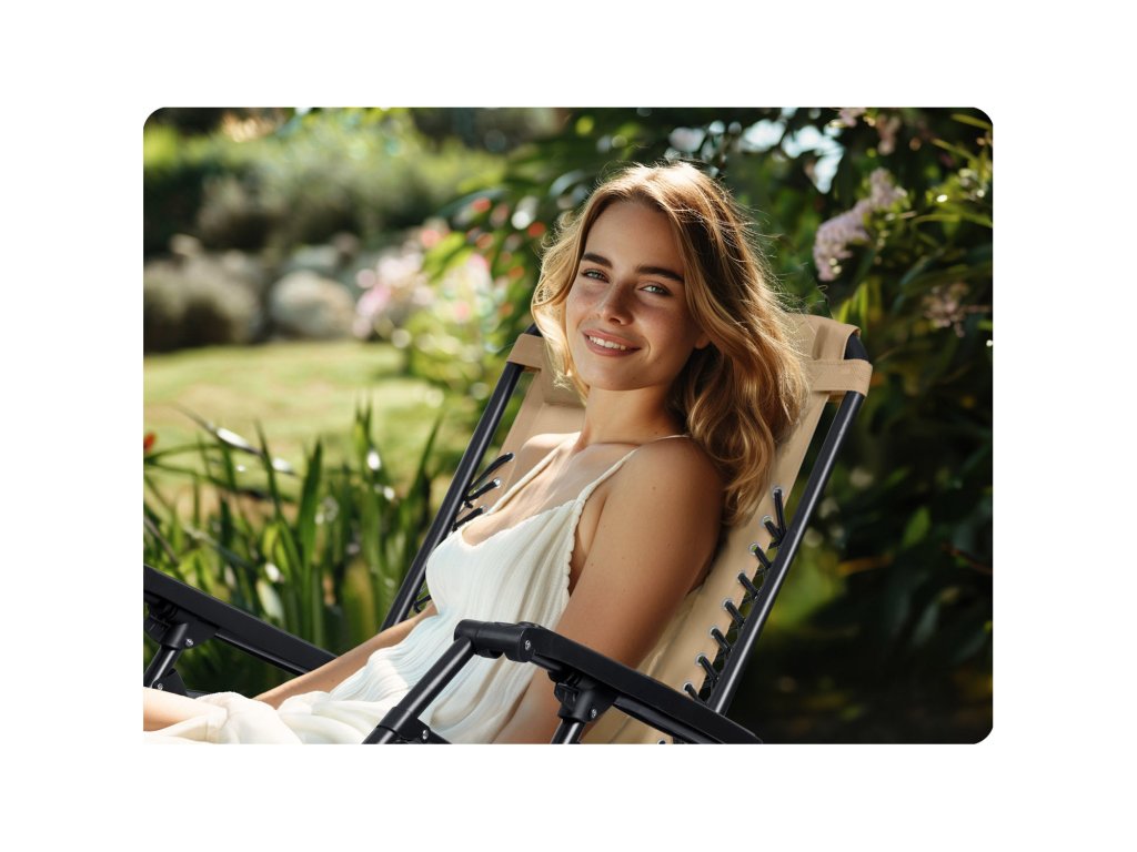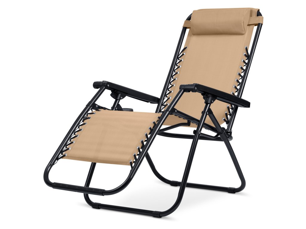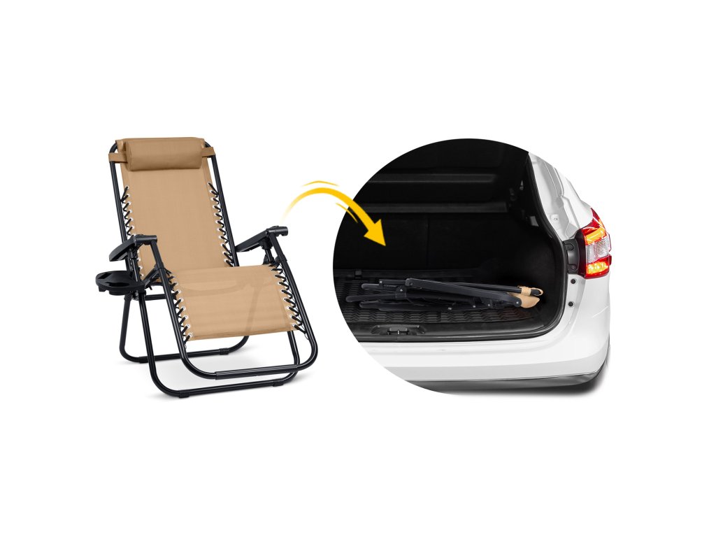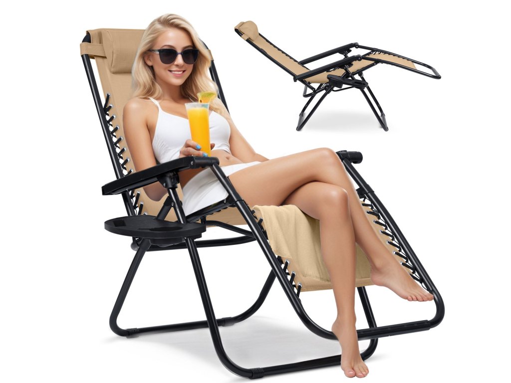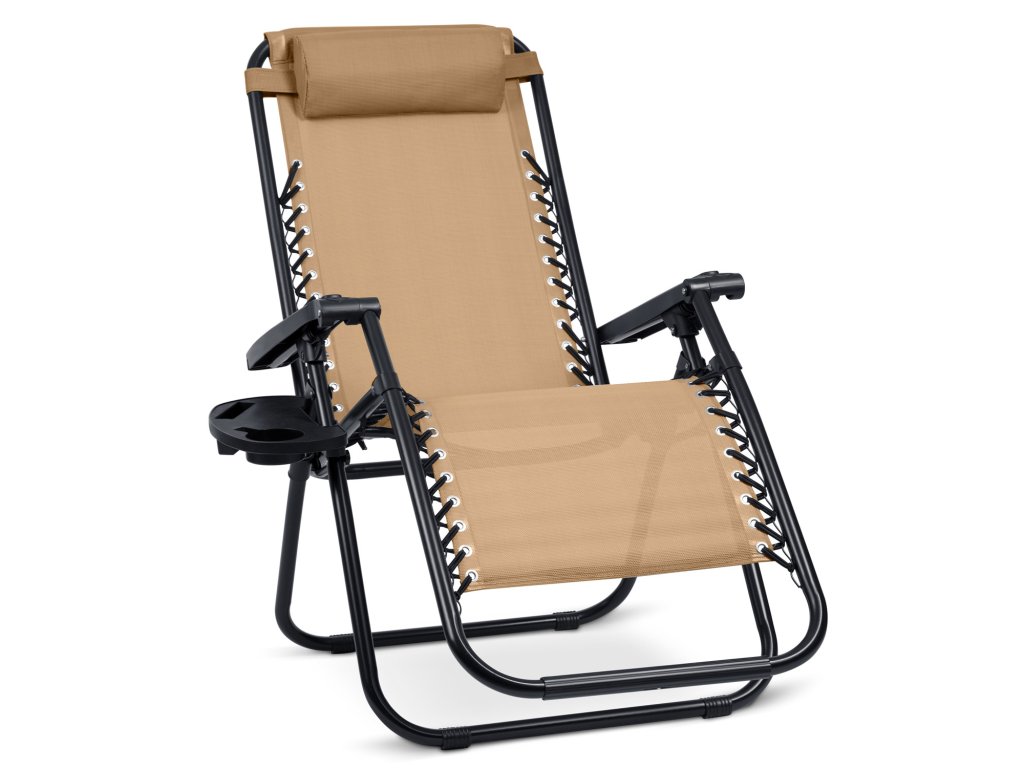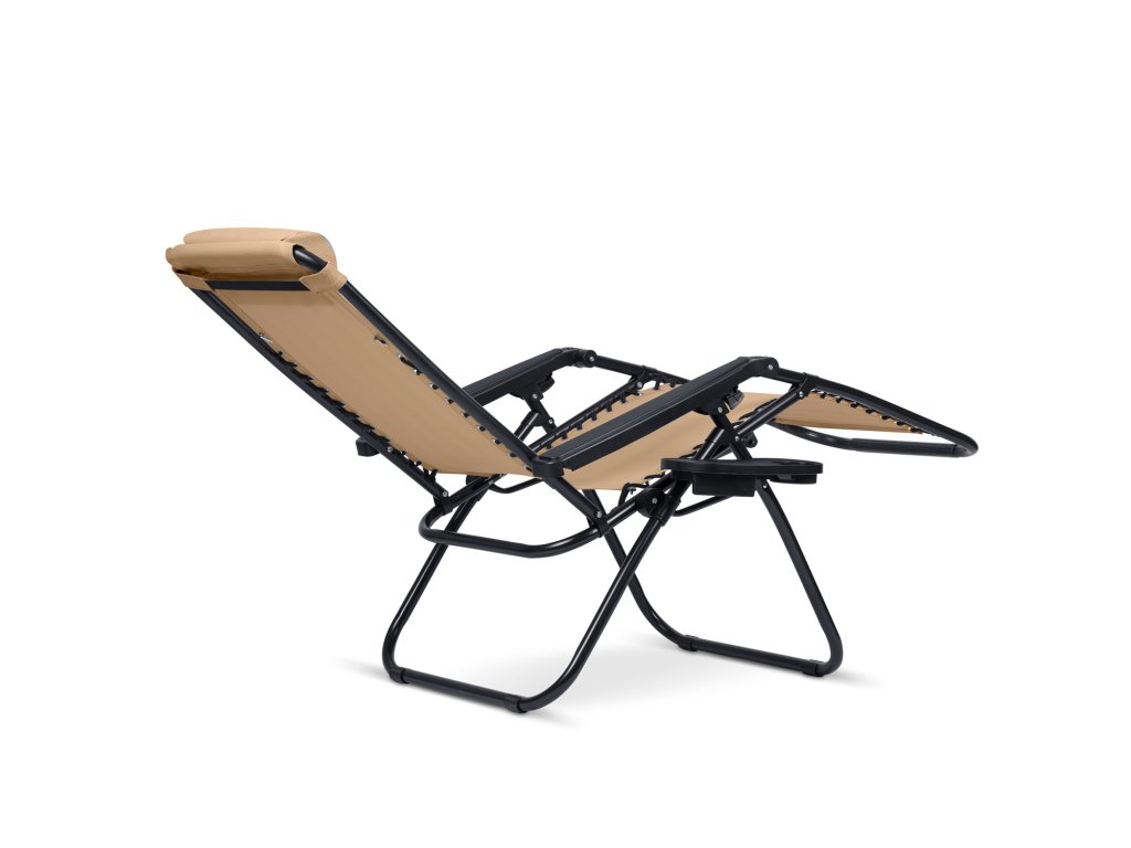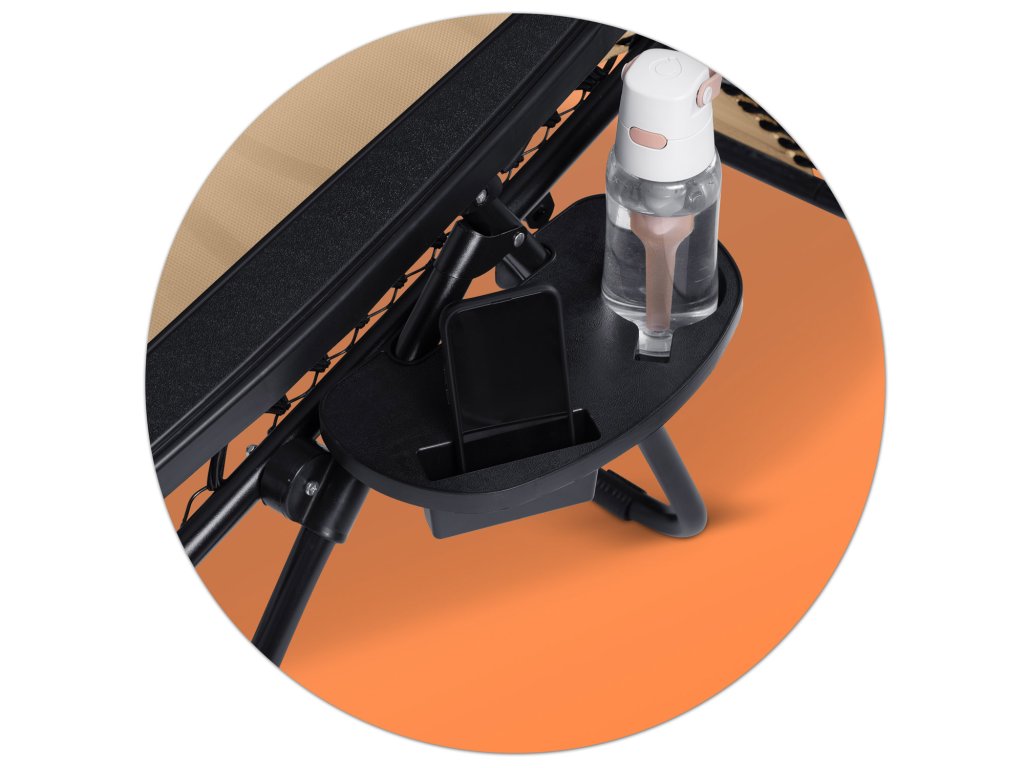 A gravitációs napozóágy párnával és mini asztallal befektetés a mindennapi friss levegőn való pihenés kényelmébe.
