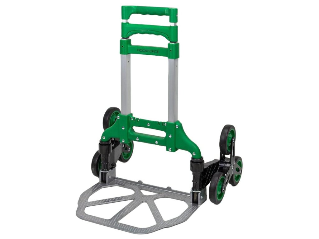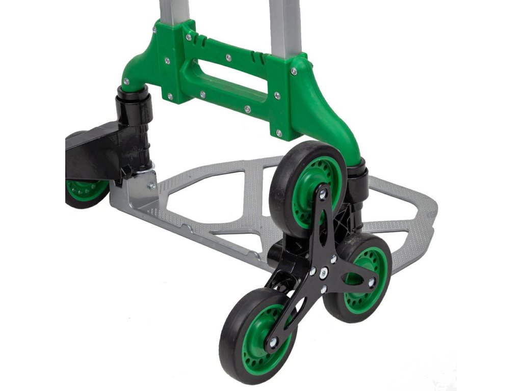 - Kifejezetten tervezett kerekekkel rendelkezik, amelyek lehetővé teszik a lépcsők legyőzését. Ideális áruk 40 kg-ig történő szállítására emeletek között.