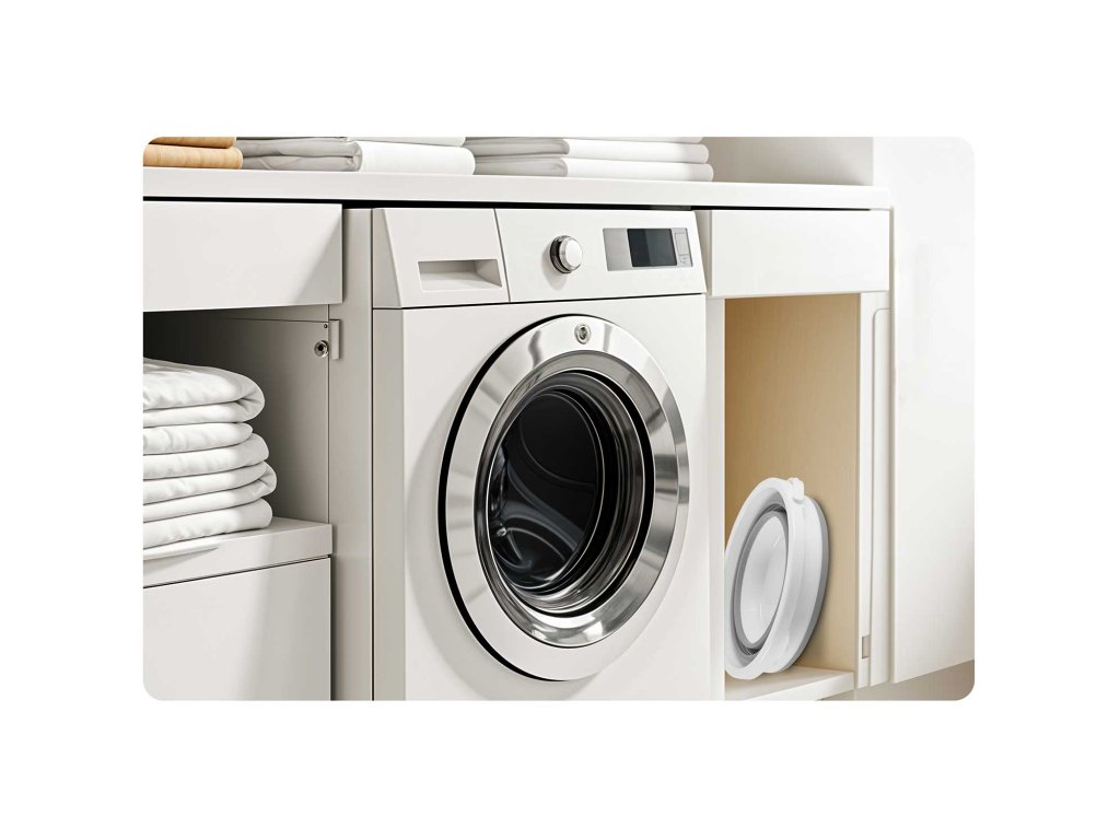 A mosás után a vödör könnyen kiüríthető a fogantyúnak és a szűrős csapónak köszönhetően, miközben leereszti a vizet kilöttyenés nélkül. A ruhát közvetlenül a vödörből fel lehet akasztani, ami minimalizálja a rendetlenséget és gyorsítja a folyamatot.
