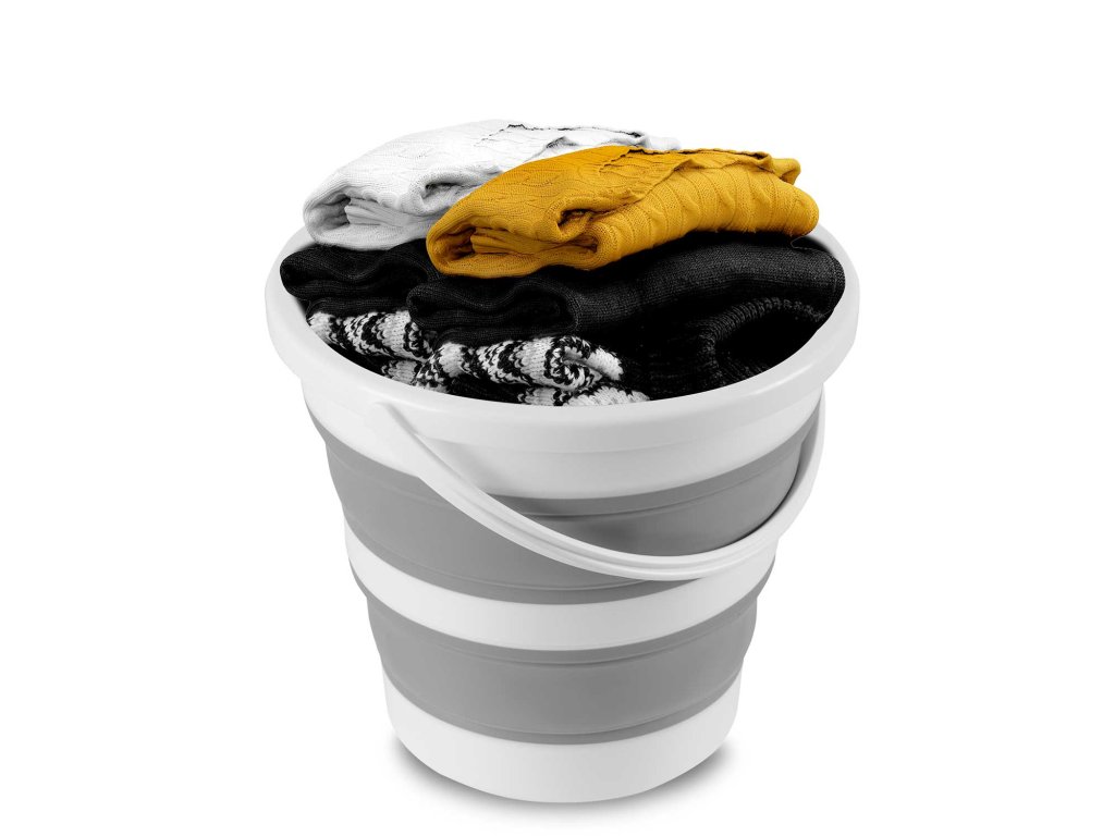 Az összecsuktható vödör gyorsan kitolható, feltölthető vízzel és tisztítószerrel. A nagy kapacitás ideális ruhák és finom alsóneműk kézi mosására.