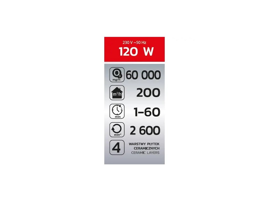 Az ózonosító masszív, tartós kialakítása hosszú távú használatot biztosít. Két munkamód (folyamatos vagy időzítővel) lehetővé teszi a hatékony levegő ózonizálását, ami alkalmazkodik a felhasználó egyéni igényeihez és a helyiség feltételeihez. Négy réteg kerámia ózongeneráló lapka növeli a hatékonyságot, ami a hatékonyabb ózontermeléshez vezet.