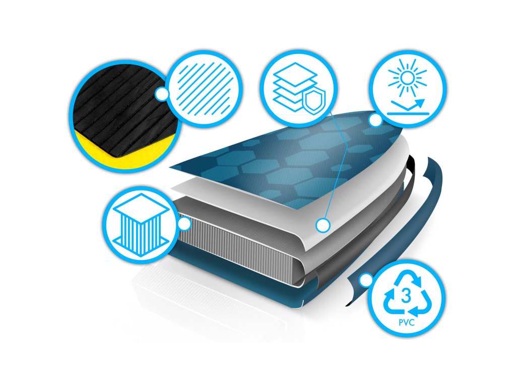 Prémium SUP deszka háromrétegű PVC szerkezettel, beépített szénszálas sínnel és megerősített varratokkal.