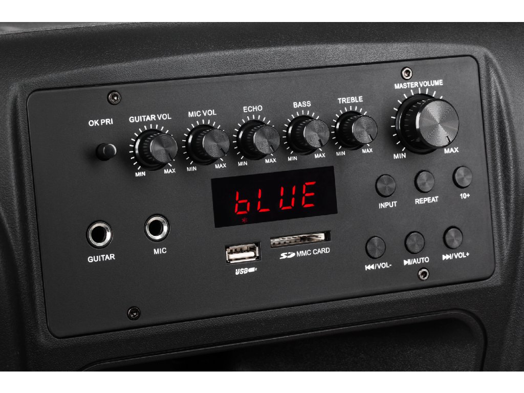 Teljesítmény: 60 W Impedancia: 4 Ohm Bemeneti hatékonyság: 95 +/- 3 dB Frekvenciatartomány: 40 Hz ~ 20 kHz Zaj/zaj viszony: >= 71 dB Harmonikus torzítás: =< 0,7% (1 W) Hangszóró: 15" + 1" vezeték nélküli mikrofon Frekvencia: 615,15 MHz / 620,85 MHz FM frekvencia: 87,50 ~ 108,00 MHz Bluetooth: 2.