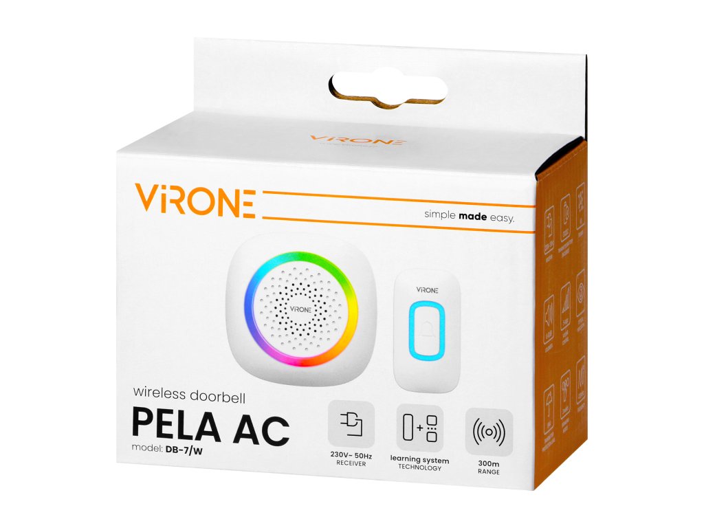 PELA AC, vezeték nélküli akkumulátoros csengő, tanulórendszer, 60 hang, RGB LED, 300m, fehér