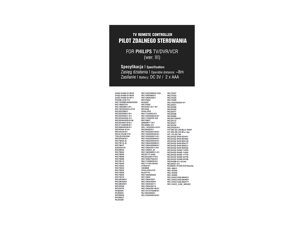 Univerzális távirányító a következő PHILIPS márkájú készülékek vezérléséhez: TV, videomagnó, DVR. A termék rendelkezik az ezen eszközök alapvető működtetéséhez szükséges gombokkal. Az egyszerű kialakítás és elrendezés teljesen egyszerű és intuitív kezelést tesz lehetővé. A távirányító gyártása során kiváló minőségű anyagokat használtak fel, hogy garantálják a termék hosszú élettartamát. Ideális eszköz a készülék vezérlésére a gyári távirányító elvesztése vagy sérülése esetén.