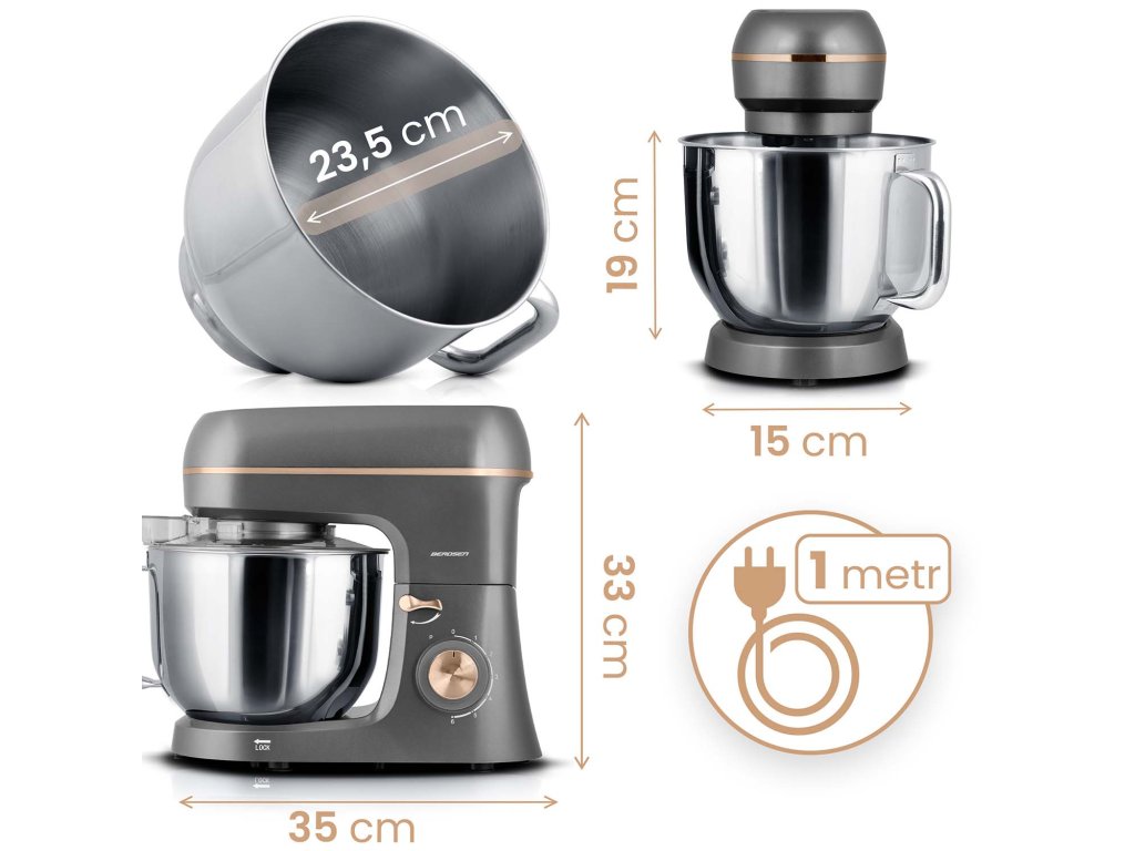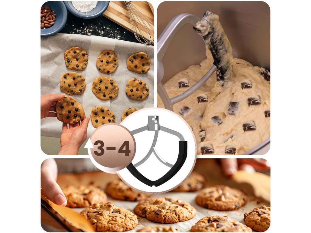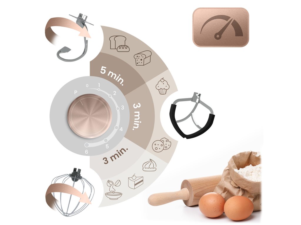 A tésztagyúró horog 1-3 sebességen működik a legjobban, a krémek és töltelékek keverője 2-4 beállításon optimálisan működik, míg a habverő 5-6 sebességen fejti ki teljes potenciálját – mindig ideális állag, kompromisszumok nélkül.