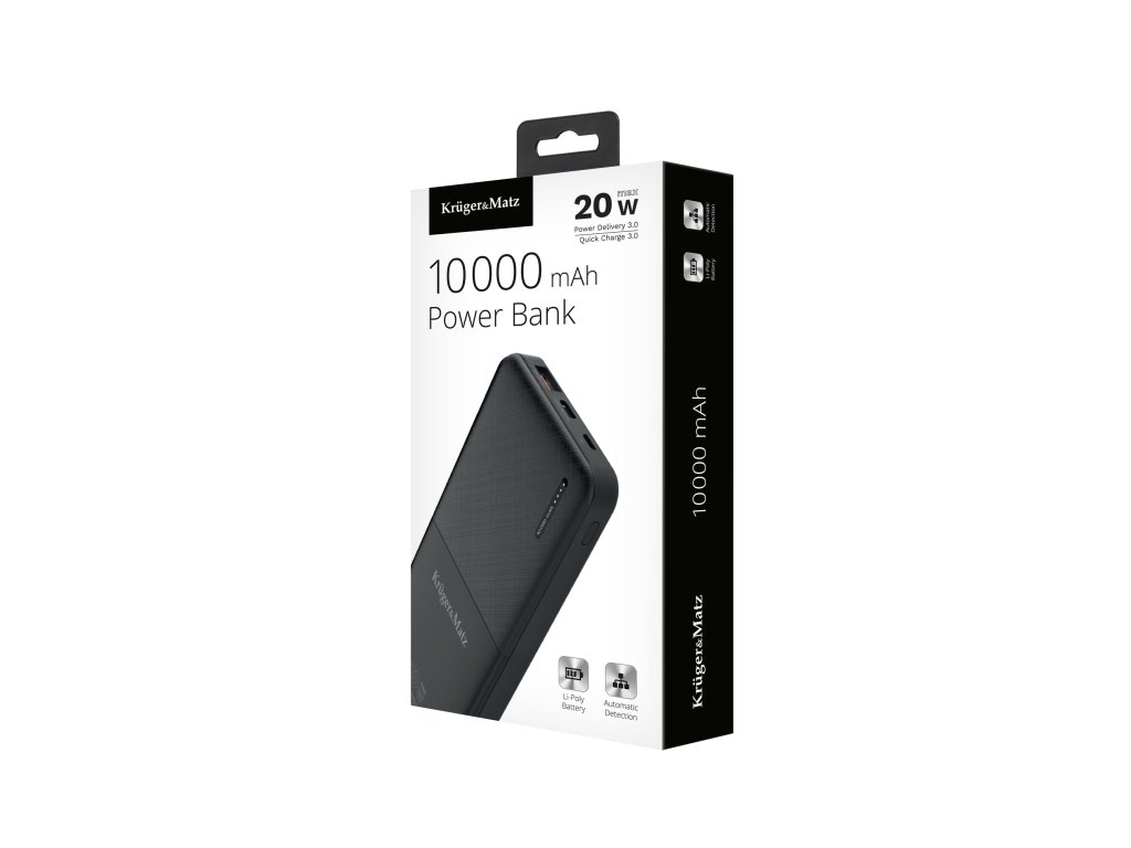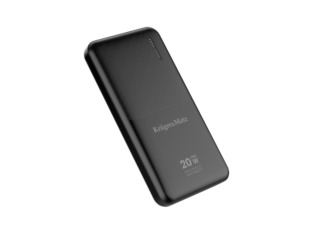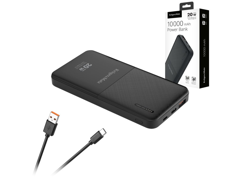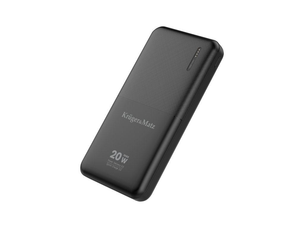 A Kruger&Matz power bank gyorstöltési funkcióval van felszerelve. A készüléktől függően használhatja a Quick Charge technológiát (töltés az USB portról) vagy a Power Delivery technológiát az USB Type-C portról. Néhány pillanat alatt újra kapcsolatban lehetsz a világgal.
