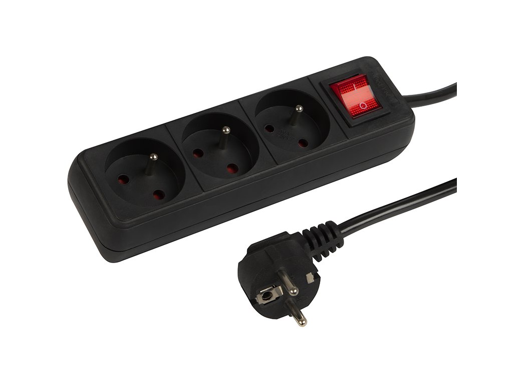 PR-370WSP földelt hálózati hosszabbító 3 aljzattal+kikapcsolóval, 2m, fekete, 3x1,5mm