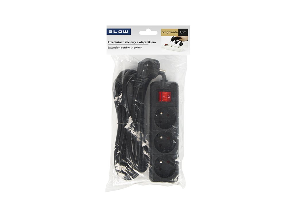 PR-370WSP hálózati hosszabbító, 3 földelt aljzattal + kapcsoló, 1,5 m, fekete (3x1,5 mm)