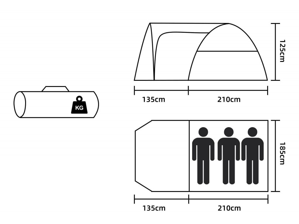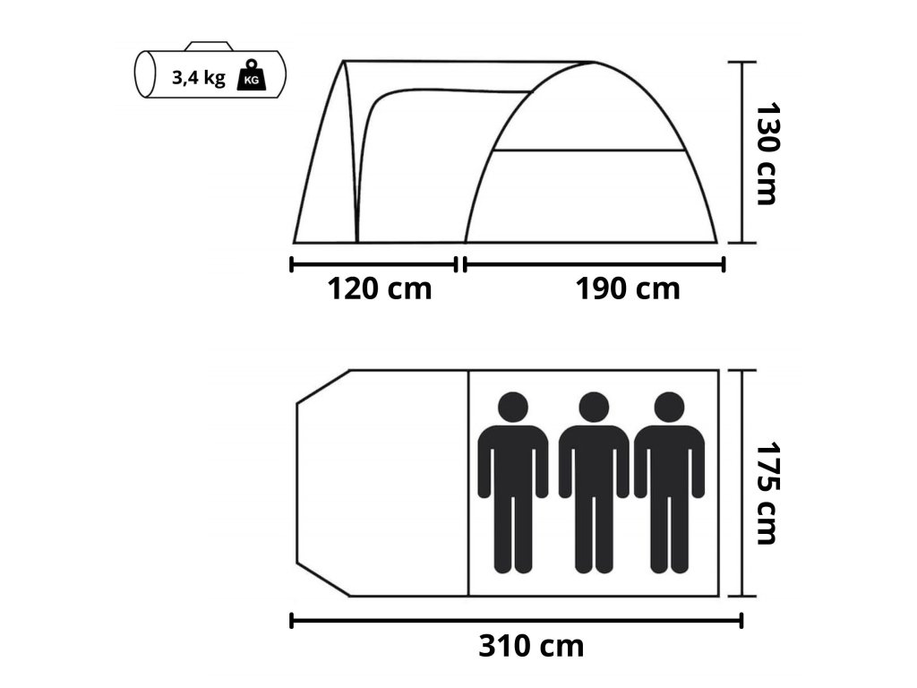 - A csomagolt sátor méretei: 60 x 15 x 15 cm