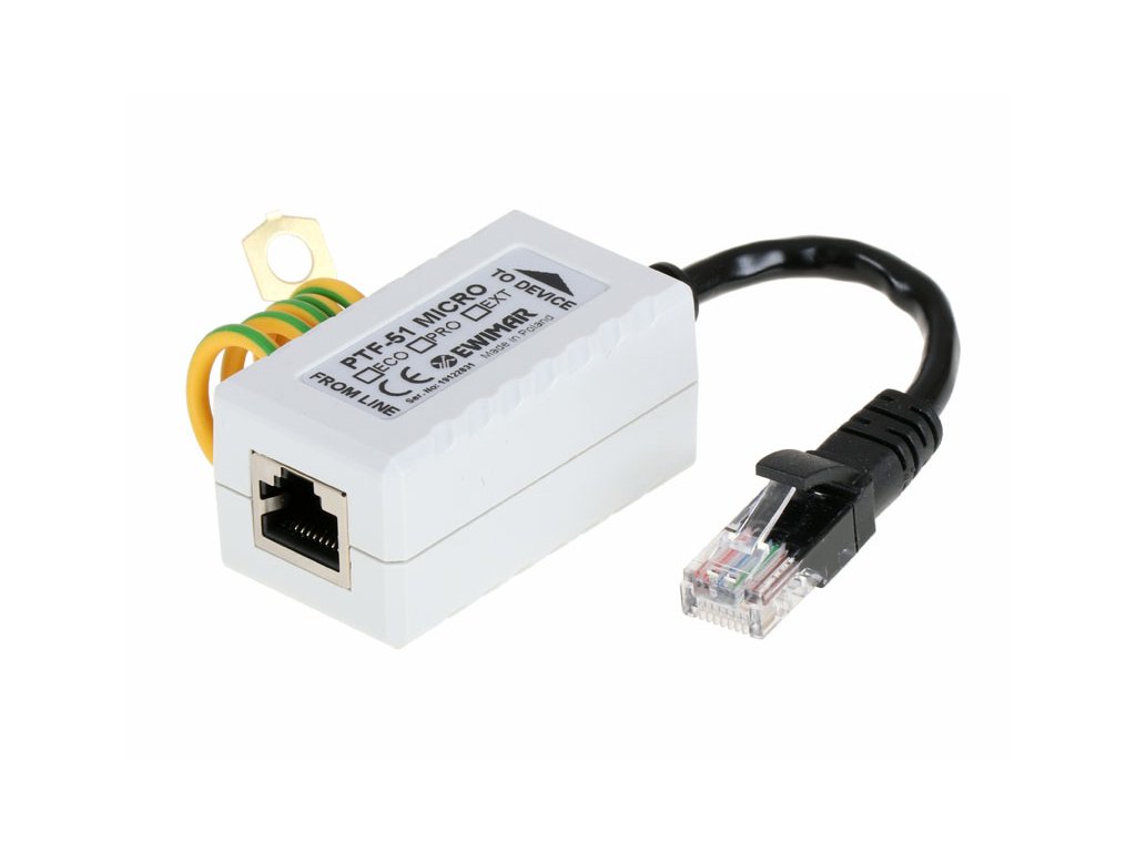 PTF-51-ECO/PoE/Micro egy miniatűr túlfeszültség-védő, amely LAN hálózatokhoz készült 100-BaseT alapú 5-ös és 6-os kategóriájú UTP kábelekre. A készülék kis méretű és beépített RJ-45 csatlakozóval ellátott kábellel van felszerelve, amely lehetővé teszi a gyors és egyszerű telepítést, és egyben a védő rejtett elhelyezését is kisméretű burkolatokban. A védelmet ipari IP kamerák védelmére is fel lehet használni. PTF-51-ECO/PoE/Micro védi a villámcsapások hatásaival, túlfeszültségekkel és vandalizmussal (stun gunok hatásával) szemben. A védő hatékony védelmet nyújt a LAN hálózatok berendezéseinek és telepítéseinek, melyek elemei épületekben találhatóak. A készülék egyenként védi minden egyes átviteli párt és megszünteti a 6V-ot meghaladó túlfeszültségeket. A professzionális összekötő rendszer további védelmet nyújt a berendezéseknek a PoE tápkábeleken bekövetkező feszültségnövekedés ellen. A 4-5 és 7-8 párok összekapcsoltak, mivel a LAN 100Base-T kizárólag PoE táplálására használja őket. PTF-51-ECO/PoE/Micro két tápláló pár csoportját védik a feszültségek 58V-ra emelkedése és a végberendezés tápellátó forrásának meghibásodása (például IP kamerák, switchek) ellen.