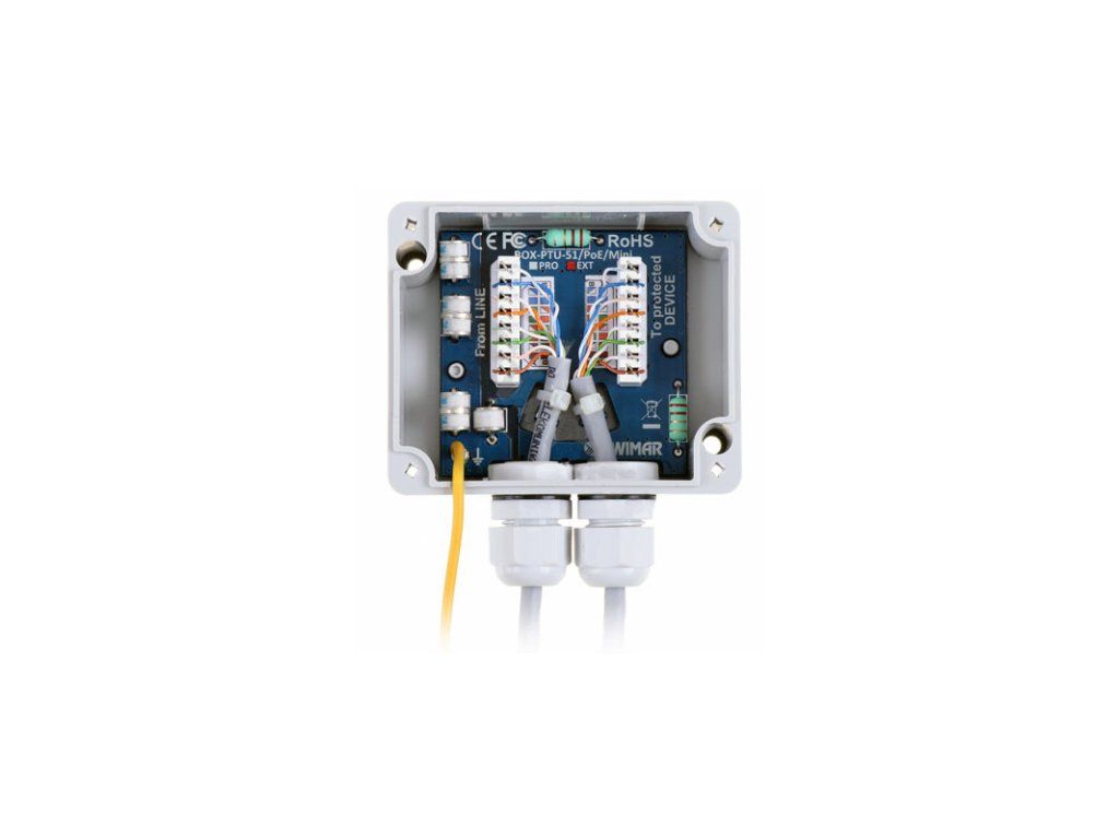 BOX PTU-51-EXT/PoE/MINI egycsatornás modul, amely a túlfeszültség-védelemért felelős IP kamerák, LAN switch-ek, routerek, WiFi hozzáférési pontok és más, 100Mbit-es hálózatokban működő eszközök számára. Az eszköz kompatibilis az UTP és FTP 5-ös és 6-os kategóriás kábelekkel. A védelem hatékonysága 4-5kA @ 8/20S egyenként minden vezetőre (a vastagságuktól függően). Ez a védelem megvédi a LAN végberendezéseket, amelyek oszlopokra vagy fém szerkezetekre, az atmoszférikus kisülések, túlfeszültségek, szabotázsok és potenciálkülönbségek hatásaitól. A földelő vezeték a földbe vezeti a feszültségi és áramimpulzusokat, amelyek a szikrák áthaladásából származnak. Az eszköz beépített MOSFET biztosíték-kal rendelkezik, amely növeli a védelmi hatékonyságot és csökkenti a kompenzáló áramokat a CCTV telepítések között.