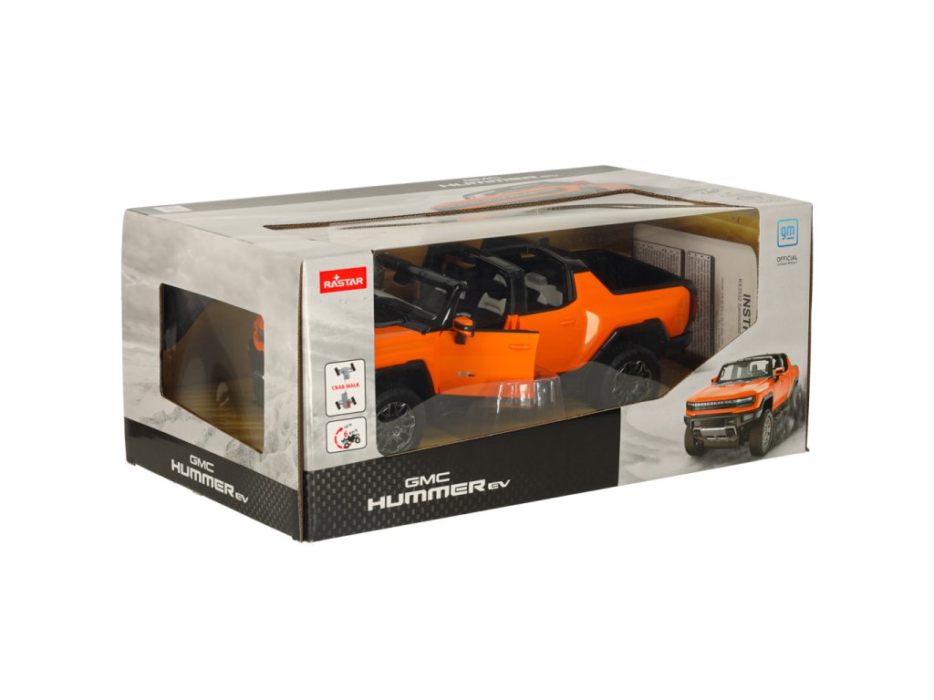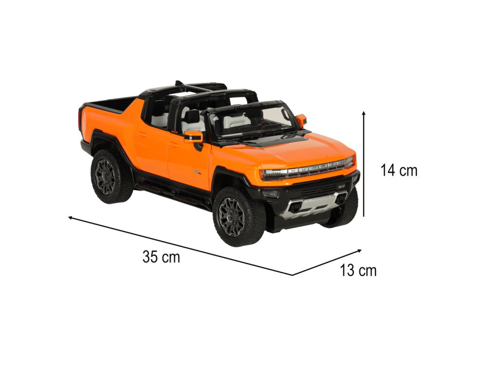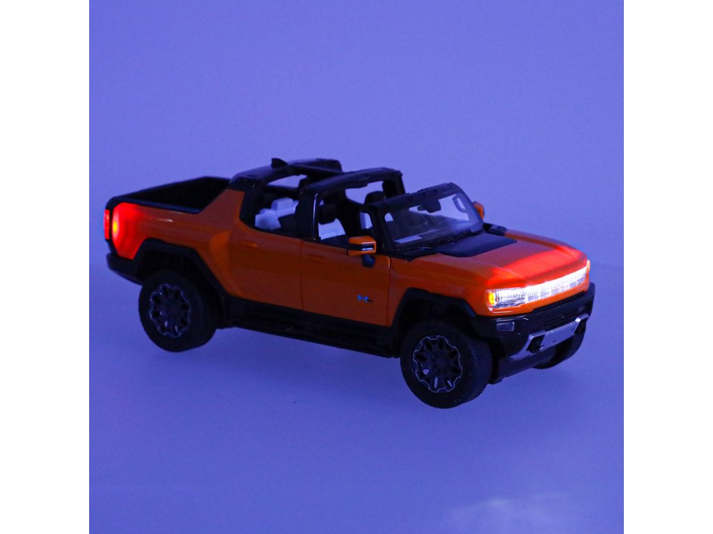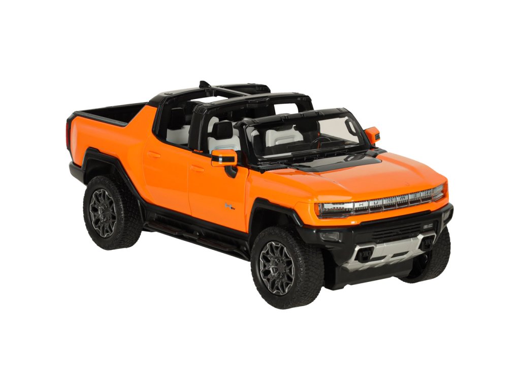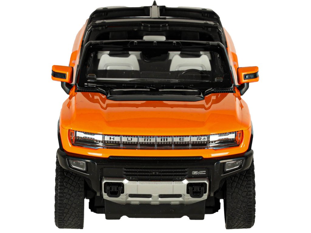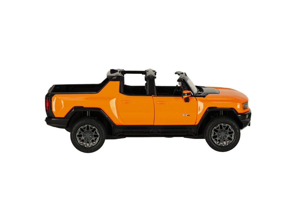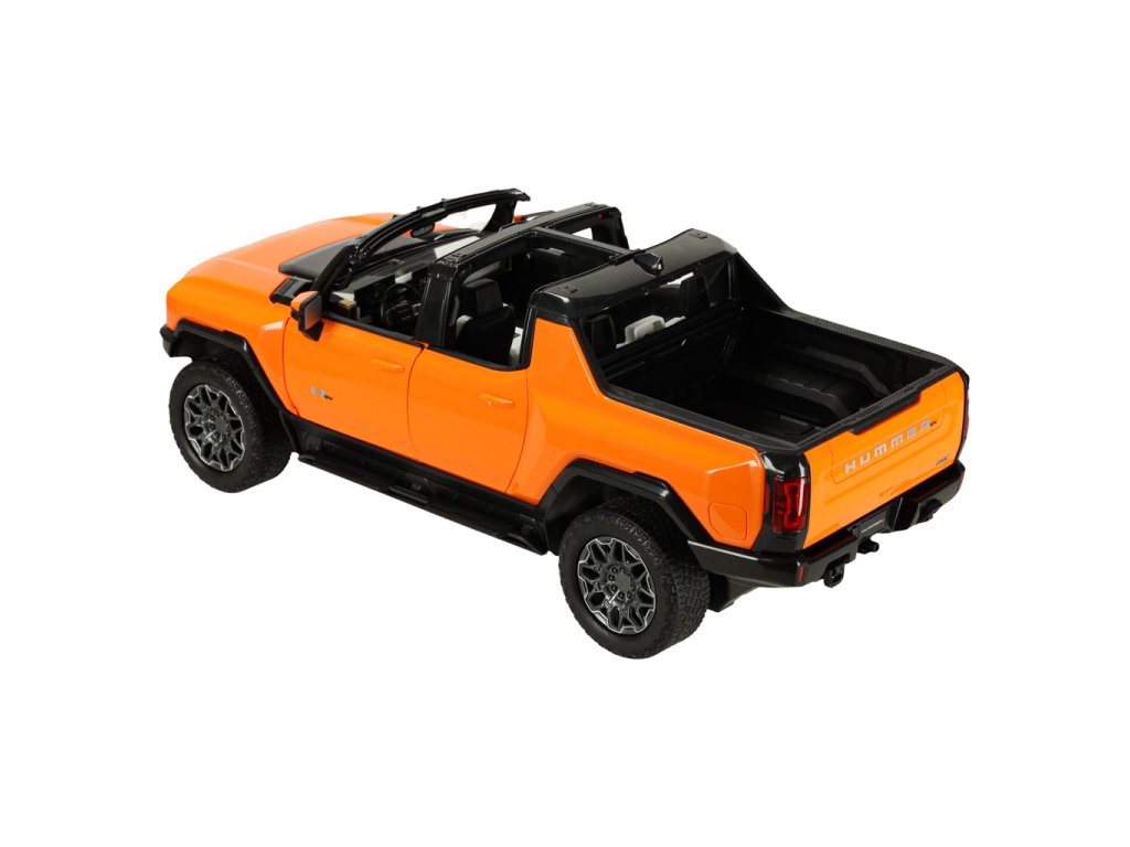 A narancssárgaHummer EV már ránézésre is lenyűgöző modern dizájnjával, amely hűen visszaadja az igazi jármű részleteit. Az aerodinamikai sziluett, a masszív felület és a Hummer logó valósághű megjelenést biztosít a modellnek.