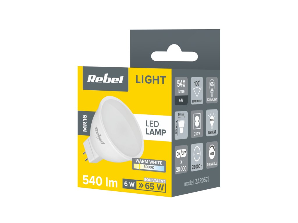 LED lámpa Rebel 6W, MR16, 3000K, 230VModern LED lámpát kínálunk, Rebel néven, 6 W teljesítménnyel, amely ideális azokhoz az alkalmazásokhoz, amelyek hatékony és gazdaságos világítást igényelnek. Az LED technológia használatával a lámpa ideális megoldást jelent azok számára, akik erőteljes világítást keresnek vonzó formában.