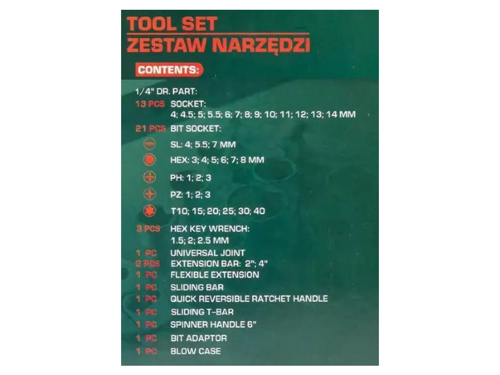 - 46 elem 1/4” – gazdag áttételes, csavarhúzó végek és szerelési kiegészítők készlete.