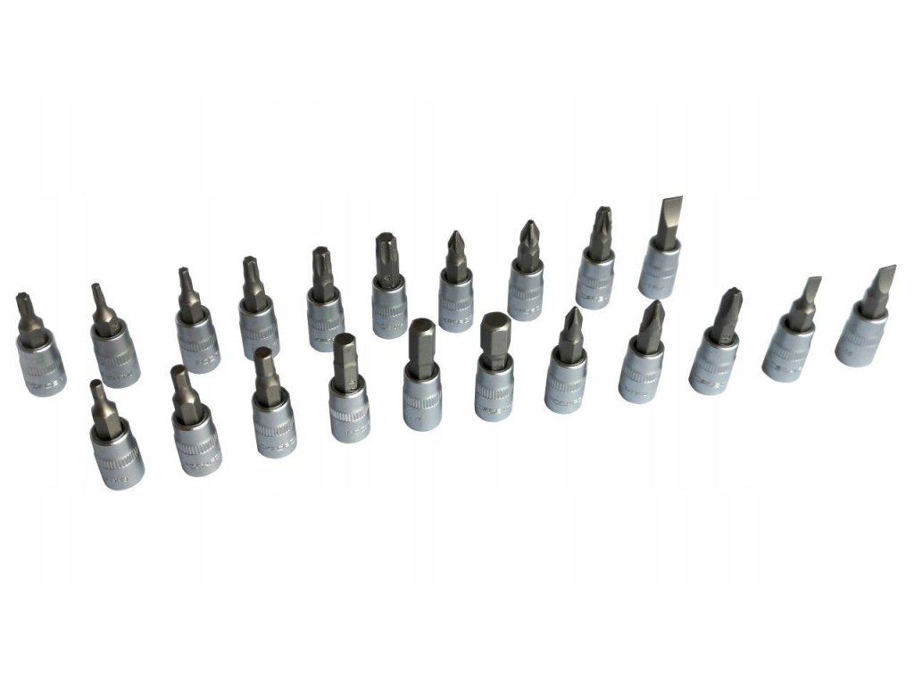 A készlet edzett acélból készült krom-vanádium CrV 50BV30, ami a hosszú élettartamot és az intenzív használattal szembeni ellenállást garantálja. Minden elemet tartósan megjelöltek – ami jelentősen megkönnyíti a munkát és a megfelelő végek kiválasztását. A DIN 3124 szabványnak megfelelő gyártás pontos illeszkedést biztosít a csavarokhoz és teljes biztonságot a munka során.