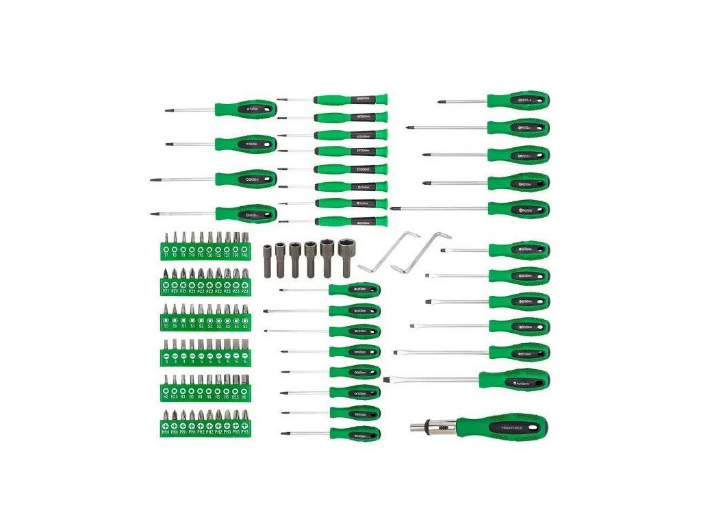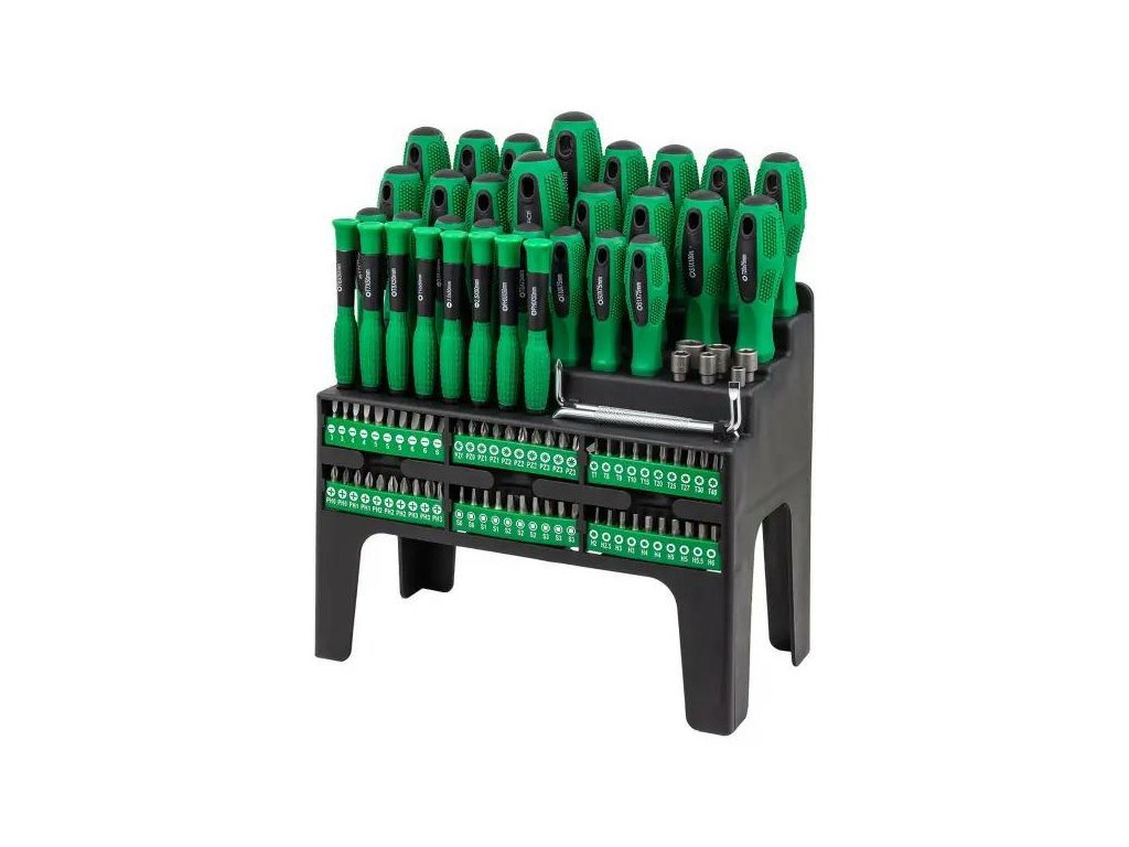 A csomagban lapos, kereszt, Torx, négyzet alakú csavarhúzók és széles választható bit és dugó választék található. Ennek köszönhetően a készlet szinte minden leggyakrabban előforduló csavar és csavar típus fedését biztosítja.