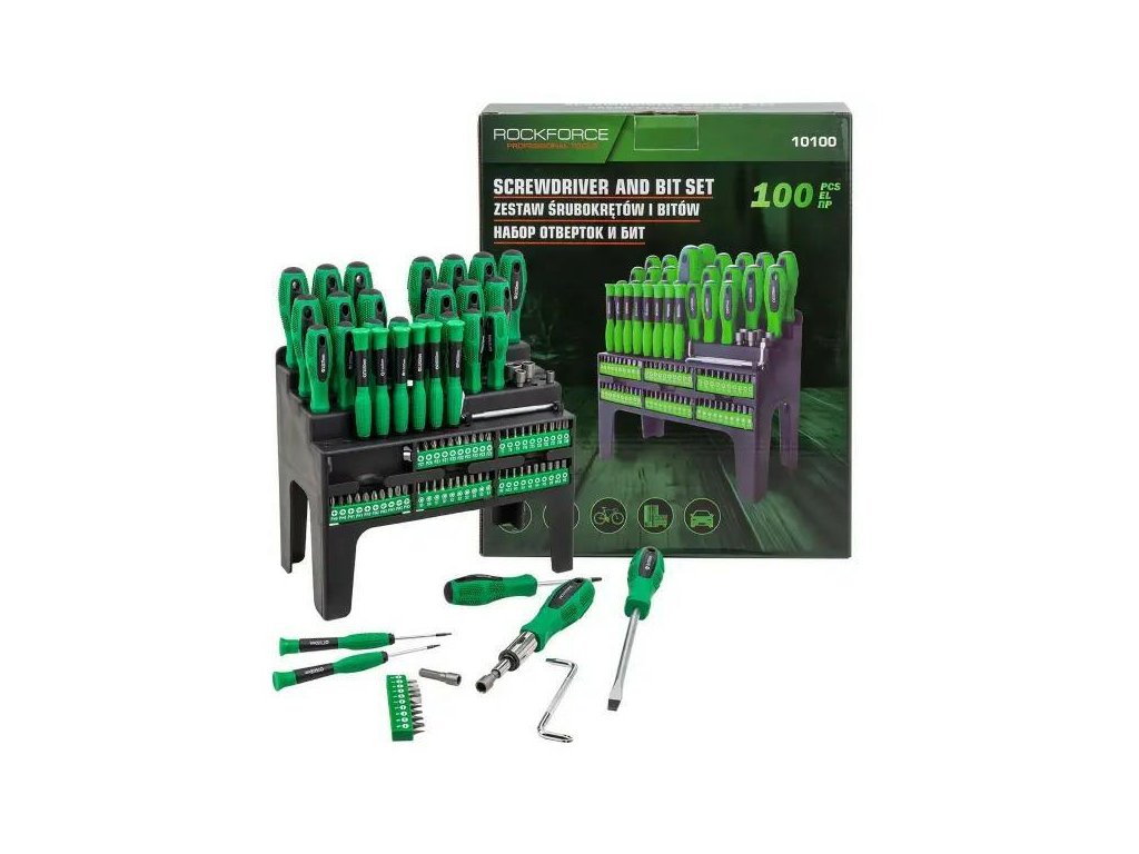A Rockforce 100 elemből álló csavarhúzó és bitek készlete egy univerzális megoldás a barkácsolók, szervizesek és szakemberek számára, akik különböző típusú és méretű szerelvényekkel való munkához széles választékú szerszámokra van szükségük. Gazdag készlet csavarhúzókból, bitekből, dugókulcs végződésekből és adagolók, ezáltal teljes körű felszerelést biztosít a műhelyhez, garázshoz, valamint otthoni használatra.