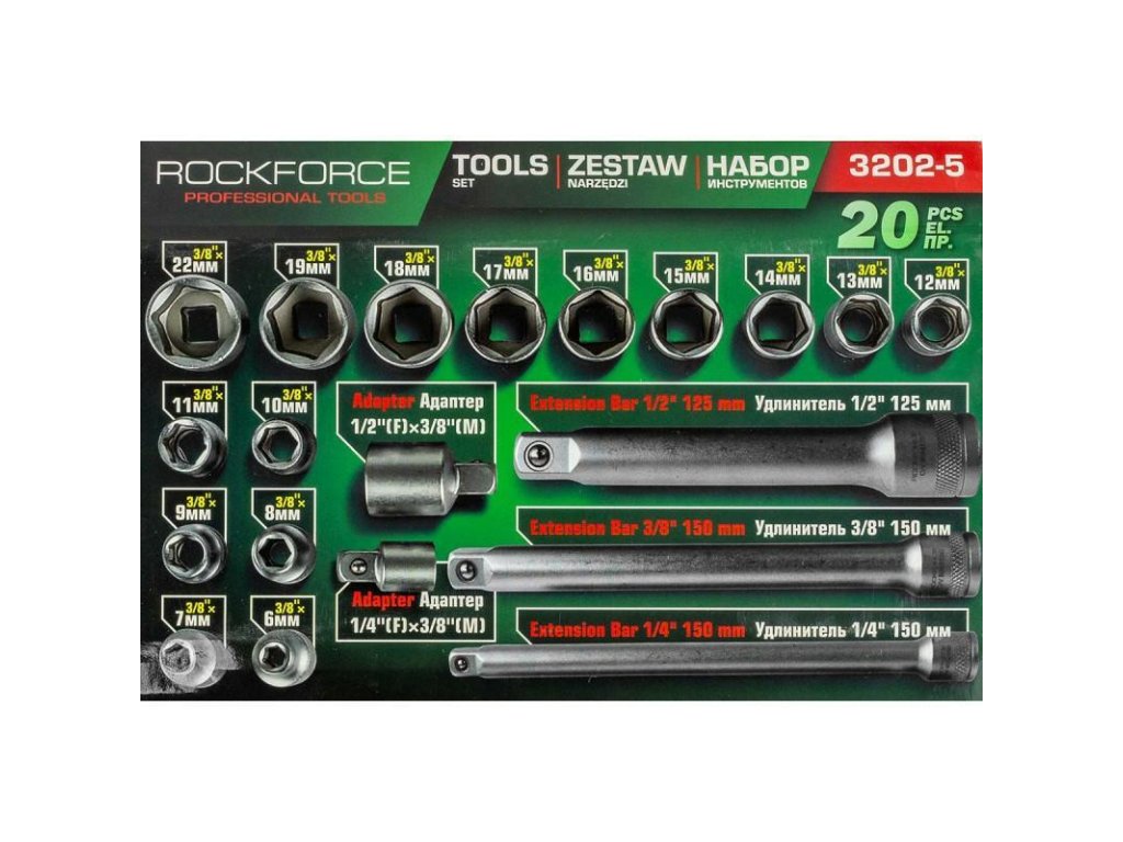 ROCKFORCE 3/8" 20 darabos dugókulcs készlet adapterekkel és hosszabbítókkal