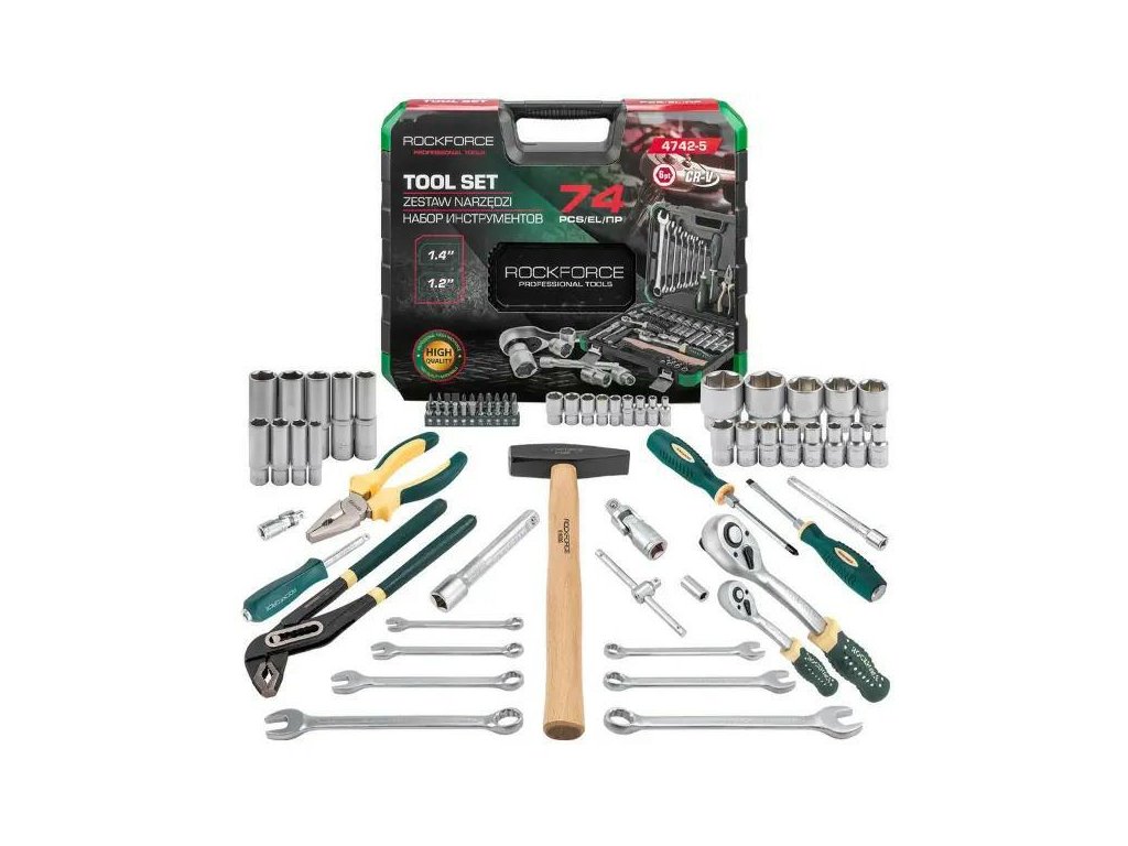 A Rockforce 74 db-os szerszámkészlet egy sokoldalú készlet, amelyet műhelyi, autós és háztartási munkákhoz terveztek. Magas minőségű, króm-vanádium acélból (Cr-V) készült elemekből áll, amelyek tartósságot, kopásállóságot és megbízható munkát garantálnak hosszú időn át. Az összes szerszám egy masszív szállító táskába van elhelyezve, amely rendet, könnyű hozzáférést és mobilitást biztosít.