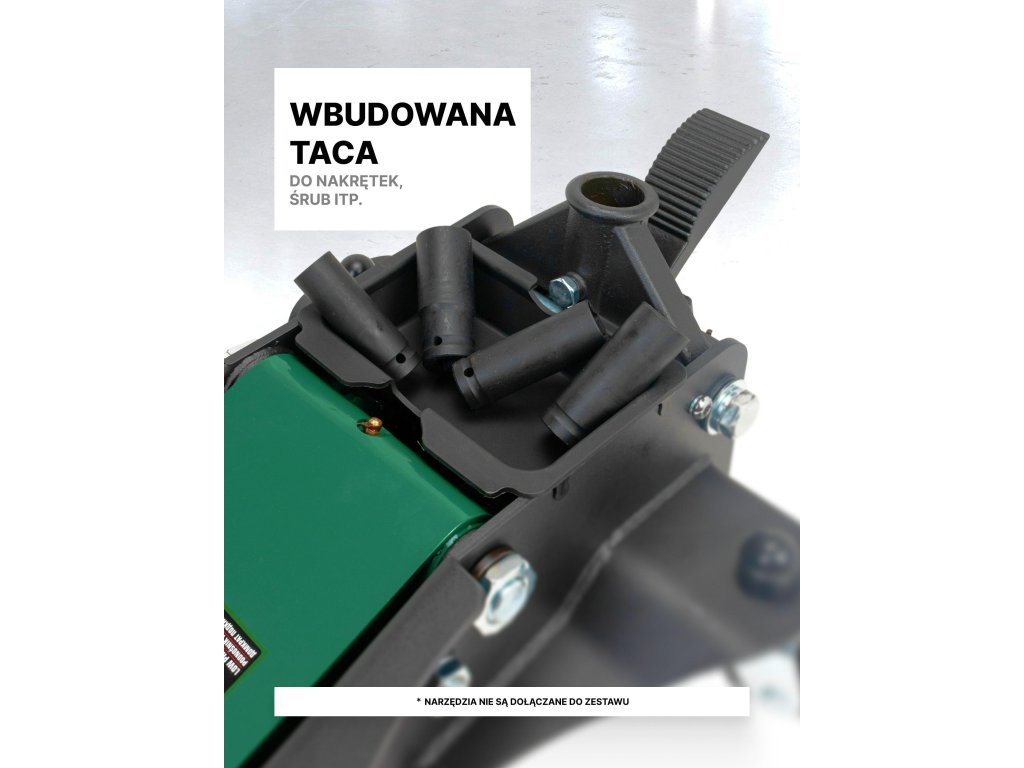 praktikus munkatálcával szerelték fel, amely a burkolat tetején található. Ebben tárolhatja az anyákat, csavarokat és egyéb apró alkatrészeket munka közben, ami kiküszöböli a földre tett alkatrészeket és minimalizálja a veszteség kockázatát. Ez egy kicsi, de rendkívül praktikus részlet, amely jelentősen felgyorsítja és megkönnyíti a munkát a műhelyben.