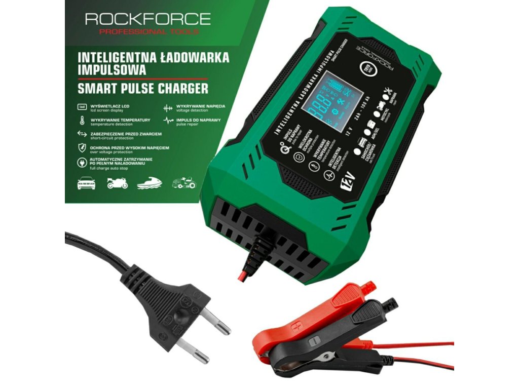 Rockforce 12V 6A töltő egy modern, mikroprocesszoros töltő új generációja, amely gyors, biztonságos és teljesen automatikus akkumulátor töltést biztosít 12V-os akkumulátorok számára. A készülék mind a professzionális műhelyek, mind az egyéni felhasználók számára készült, akik megbízhatóságot, biztonságot és maximális hatékonyságot várnak el. Az intelligens vezérlés, a számos védelmi funkció és a gazdag diagnosztikai és regenerációs funkciók révén a Rockforce töltő sokkal több, mint egy egyszerű töltő – ez az akkumulátorok teljes körű kezelőközpontja.