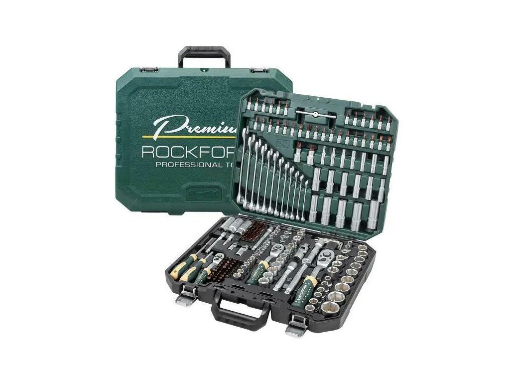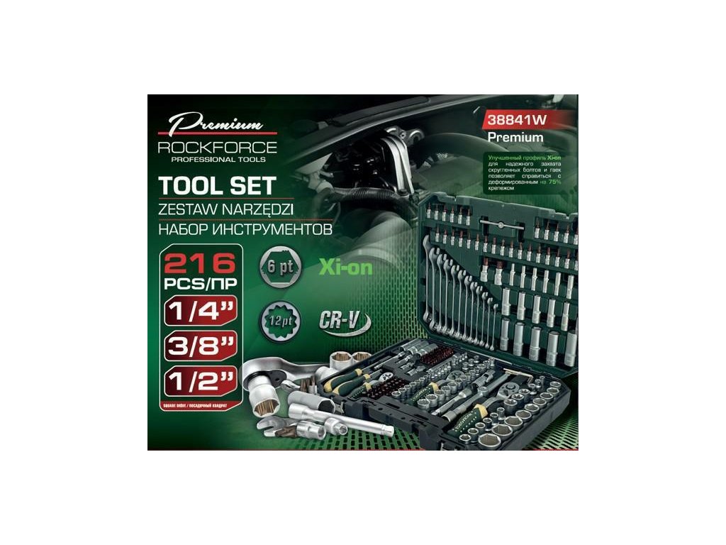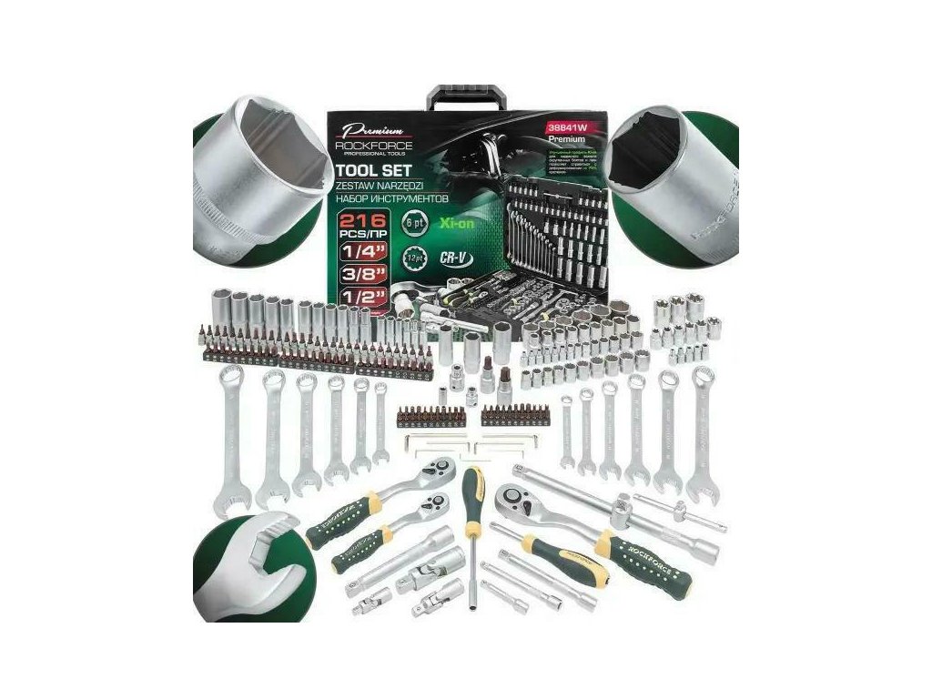 Rockforce RF-38841W-Premium egy sokszorosított eszközkészlet, amelyet intenzív használatra terveztek – mind professzionális műhelyekben, mind otthoni garázsokban. A készlet 216 gondosan kiválasztott eszközt tartalmaz, amelyek kompatibilisek három meghajtómérettel: 1/4”, 3/8” és 1/2”, 6- és 12-szögletes változatokban.