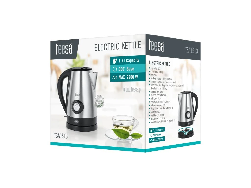 Alapos tetejű vízforraló lehetővé teszi, hogy bármilyen mennyiségű vizet felforraljon, még a legkisebbet is. Másrészt, ha a teljes 1,7 literes térfogatot fel kell forralnia, a Teesa 2200 W-os vízforraló lehetővé teszi, hogy ezt viszonylag rövid idő alatt tegye meg. A biztonságot az automatikus kikapcsolási funkció és avíz nélküli bekapcsolás elleni védelem garantálja.