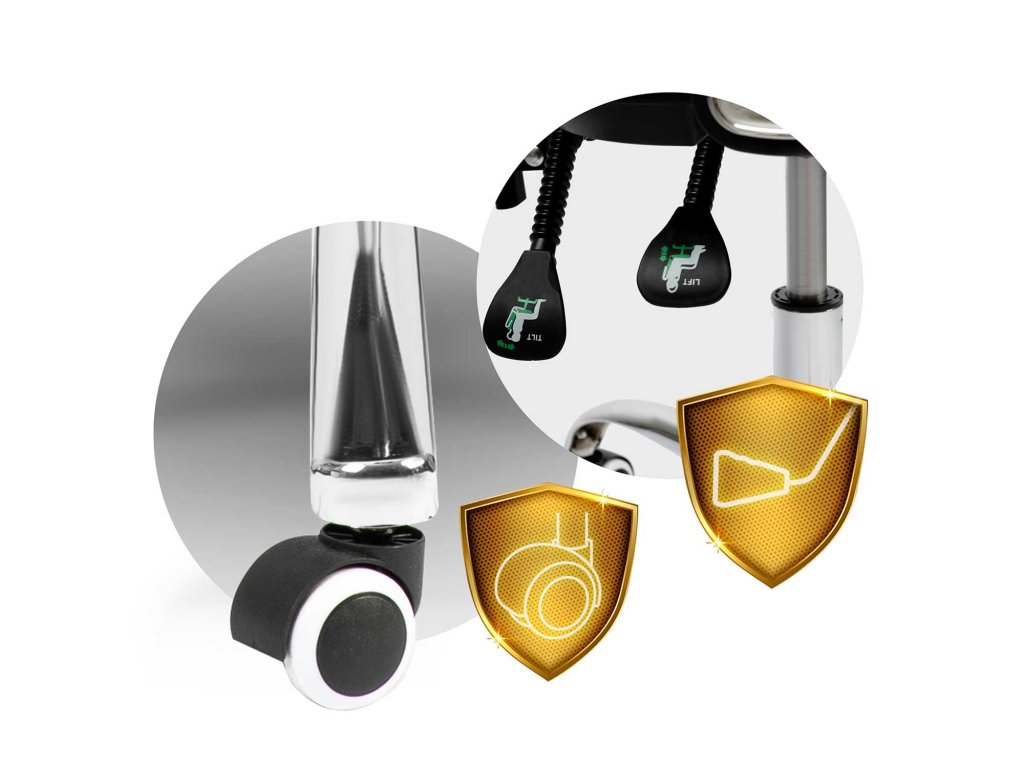 Amasszív fém talapzat nejlon-gumi görgőkkel van ellátva, amelyek csendesen mozognak és nem karcolják a padlót.